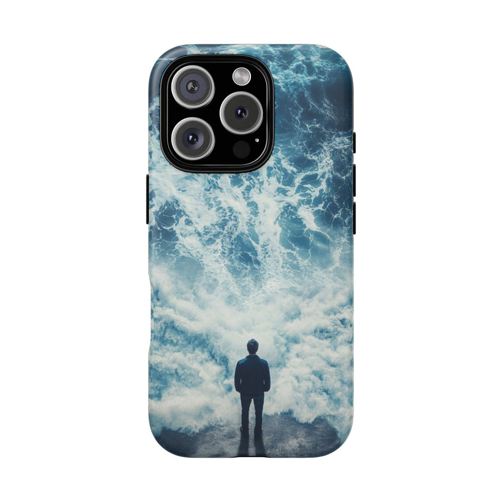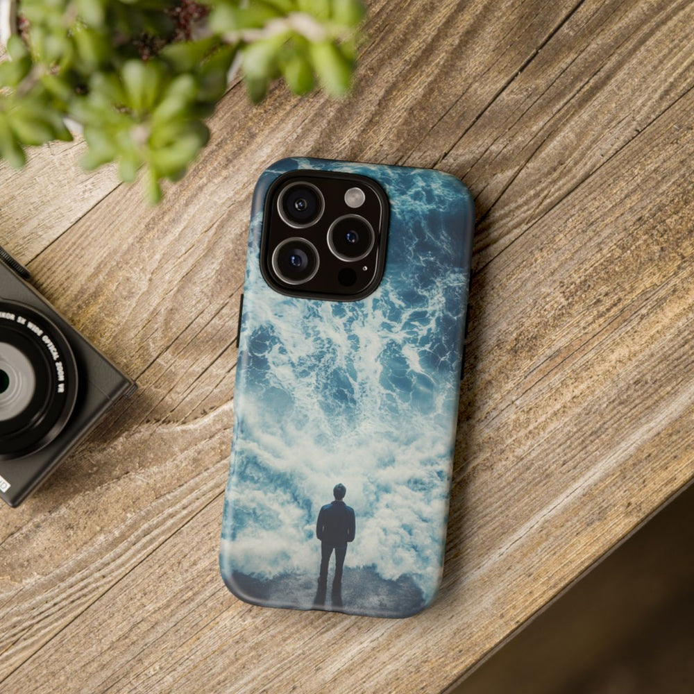Dit telefoonhoesje toont een persoon die op een donkere ondergrond staat en uitkijkt over een onstuimige oceaan. De golven zijn schuimend en wit, wat mooi afsteekt tegen het diepe blauw van het water. De persoon is van achteren te zien, gekleed in donkere kleding en werpt een schaduw op de grond. Deze afbeelding vangt de krachtige en dynamische beweging van de zee. Het matte, stevige hoesje is gemaakt van polycarbonaat en TPU, en biedt uitstekende bescherming en duurzaamheid, ook buitenshuis. Ondersteunt draadloos opladen.
