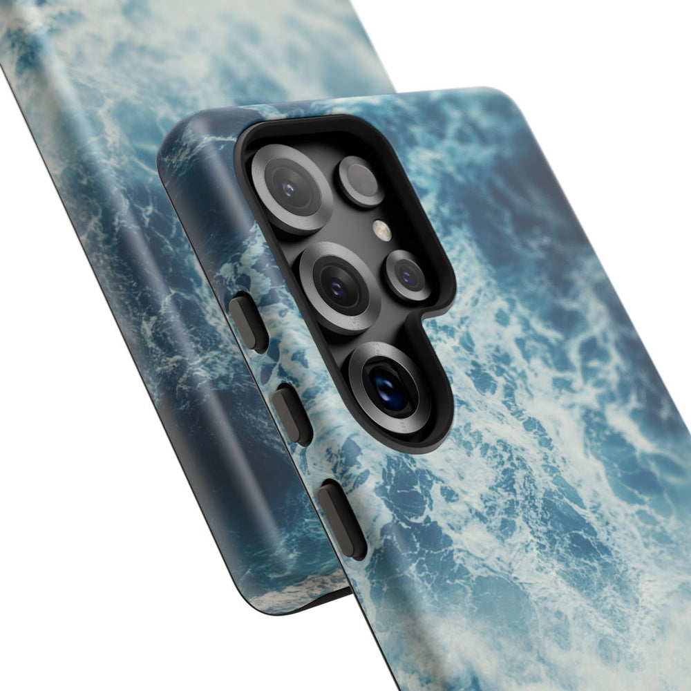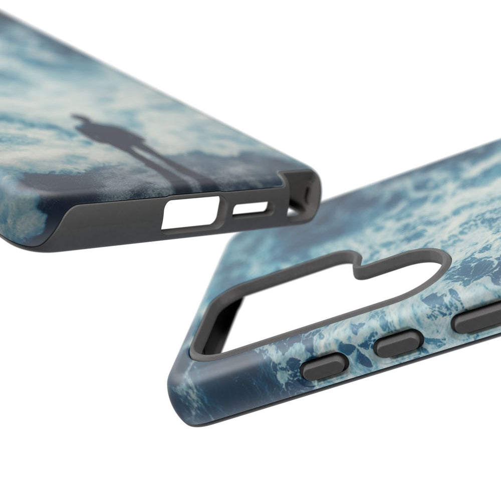 Dit telefoonhoesje toont een persoon die op een donkere ondergrond staat en uitkijkt over een onstuimige oceaan. De golven zijn schuimend en wit, wat mooi afsteekt tegen het diepe blauw van het water. De persoon is van achteren te zien, gekleed in donkere kleding en werpt een schaduw op de grond. Deze afbeelding vangt de krachtige en dynamische beweging van de zee. Het matte, stevige hoesje is gemaakt van polycarbonaat en TPU, en biedt uitstekende bescherming en duurzaamheid, ook buitenshuis. Ondersteunt draadloos opladen.