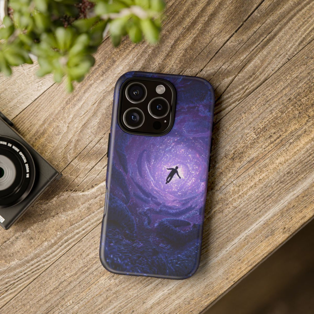 Dit ontwerp toont de schaduw van een man die valt door een draaiende kosmische tunnel. Vanuit de wanden reiken donkere, getextureerde tentakels naar binnen. In het midden straalt een heldere, sterrenachtige gloed, wat zorgt voor diepte en beweging. De kleuren bestaan voornamelijk uit diepe blauwtinten en paars. Het telefoonhoesje heeft een dubbele laag met een matte afwerking en is gemaakt van polycarbonaat en TPU voor extra stevigheid en bescherming. Ondersteunt draadloos opladen.