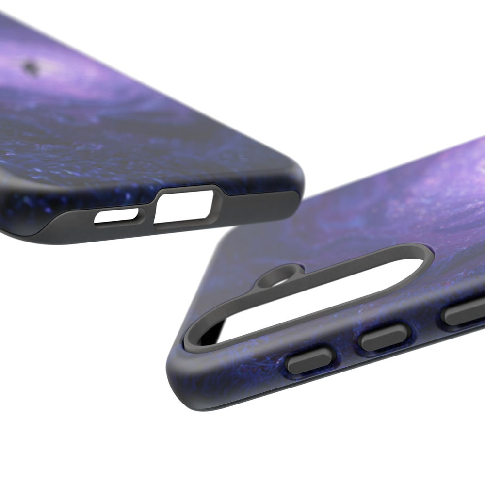 Dit ontwerp toont de schaduw van een man die valt door een draaiende kosmische tunnel. Vanuit de wanden reiken donkere, getextureerde tentakels naar binnen. In het midden straalt een heldere, sterrenachtige gloed, wat zorgt voor diepte en beweging. De kleuren bestaan voornamelijk uit diepe blauwtinten en paars. Het telefoonhoesje heeft een dubbele laag met een matte afwerking en is gemaakt van polycarbonaat en TPU voor extra stevigheid en bescherming. Ondersteunt draadloos opladen.
