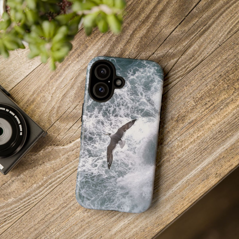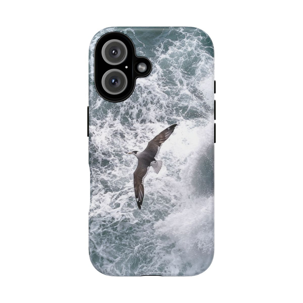 Dit ontwerp toont een meeuw die van bovenaf zweeft boven woeste oceaangolven die tegen een ruige, rotsachtige klif slaan. Het water is een combinatie van diepblauw en wit schuim, wat zorgt voor een dynamisch en natuurlijk kustlandschap. De klif is gedetailleerd weergegeven met aardse bruine en grijze tinten. Het hoesje heeft een dubbele laag met een matte afwerking, een stevige polycarbonaat buitenkant en een TPU-binnenzijde. Geschikt voor draadloos opladen.