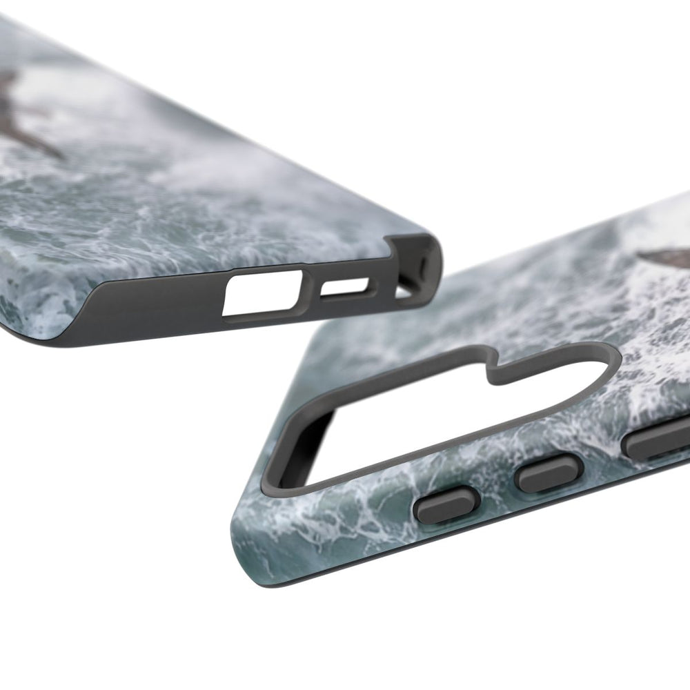Dit hoesje toont een vogelperspectief van een meeuw die over een rotsachtige kustlijn zweeft, terwijl oceaangolven tegen de rotsen slaan. Het water is diepblauw met witte schuimkoppen, wat zorgt voor een levendige en natuurlijke uitstraling. Het hoesje heeft een dubbele laag met een polycarbonaat buitenkant en een TPU-binnenzijde voor extra stevigheid en bescherming. Geschikt voor draadloos opladen en bestand tegen invloeden van buitenaf.