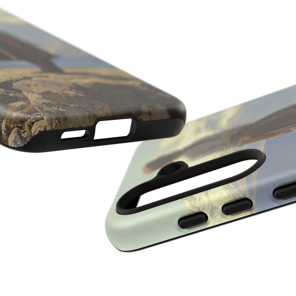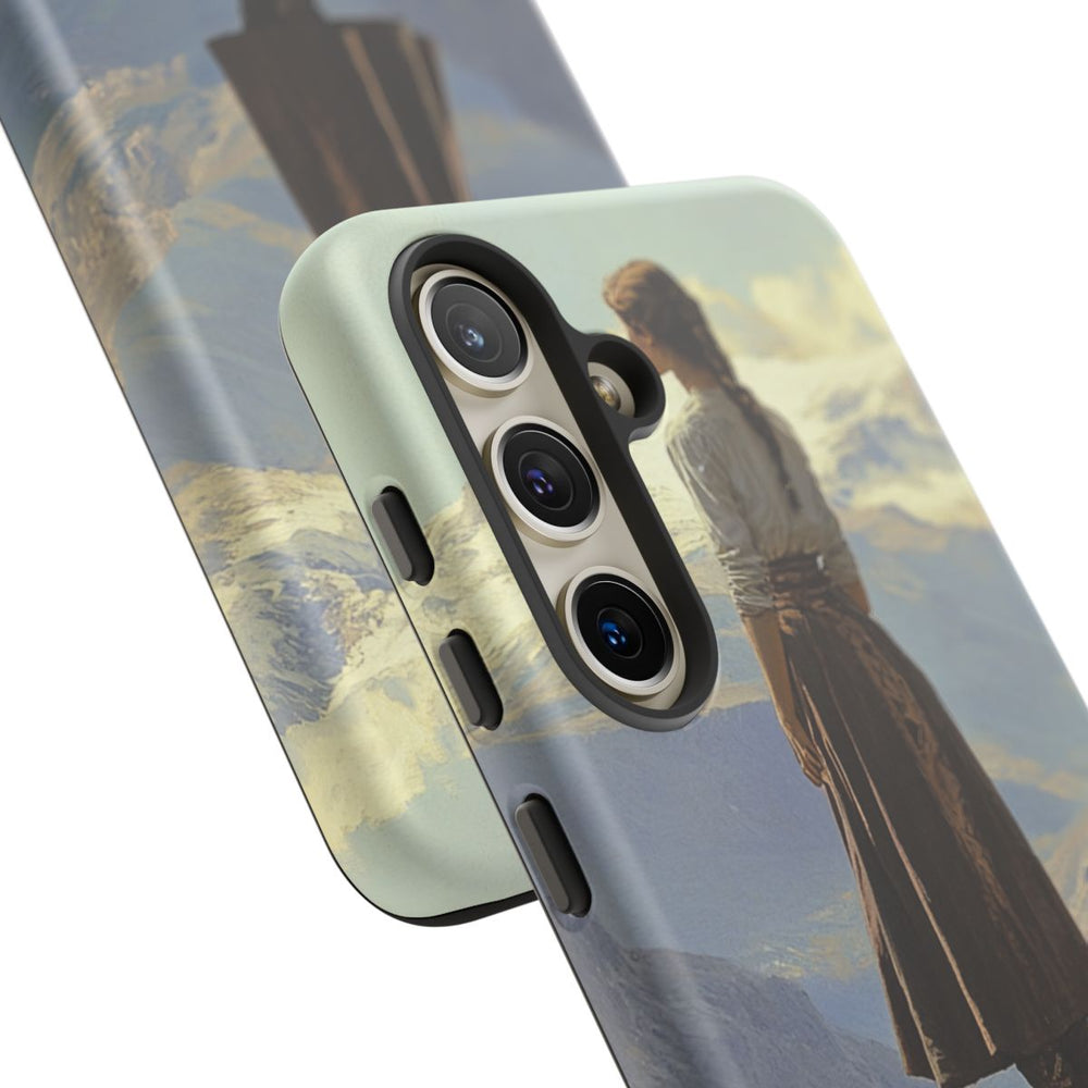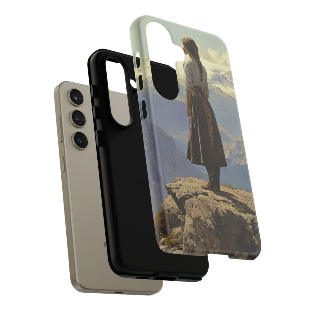 Dit hoesje toont een meisje dat op een rots staat in een indrukwekkend berglandschap. Ze kijkt uit over uitgestrekte bergen en dalen, met besneeuwde toppen op de achtergrond. Het meisje draagt een lange rok en een witte blouse, en haar haar is in een vlecht gedragen. Het ontwerp straalt avontuur en bezinning in de natuur uit. De afbeelding is gedrukt op een mat, stevig hoesje van 100% polycarbonaat en 100% TPU, met een dubbele laag voor extra bescherming. Geschikt voor draadloos opladen, maar niet voor MagSafe.