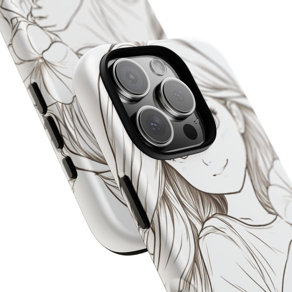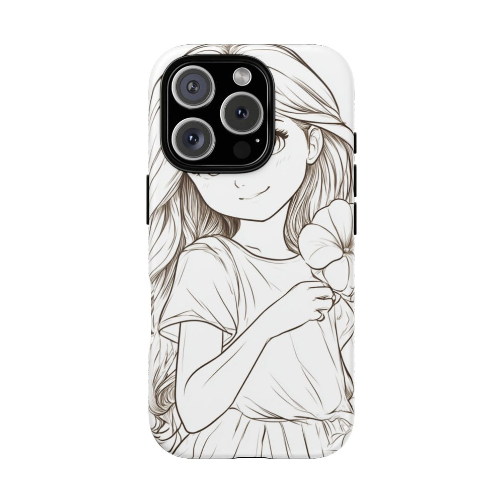 Dit telefoonhoesje is bedrukt met een lijntekening van een meisje met lang golvend haar dat een winde bloem vasthoudt. Ze wordt omringd door meerdere winde bloemen en bladeren. De stijl is eenvoudig, met dikke lijnen en zonder schaduwen, wat doet denken aan een kleurplaat. Het matte hoesje bestaat uit een stevige polycarbonaat buitenkant en een TPU binnenzijde. Geschikt voor draadloos opladen en ideaal voor gebruik buitenshuis.