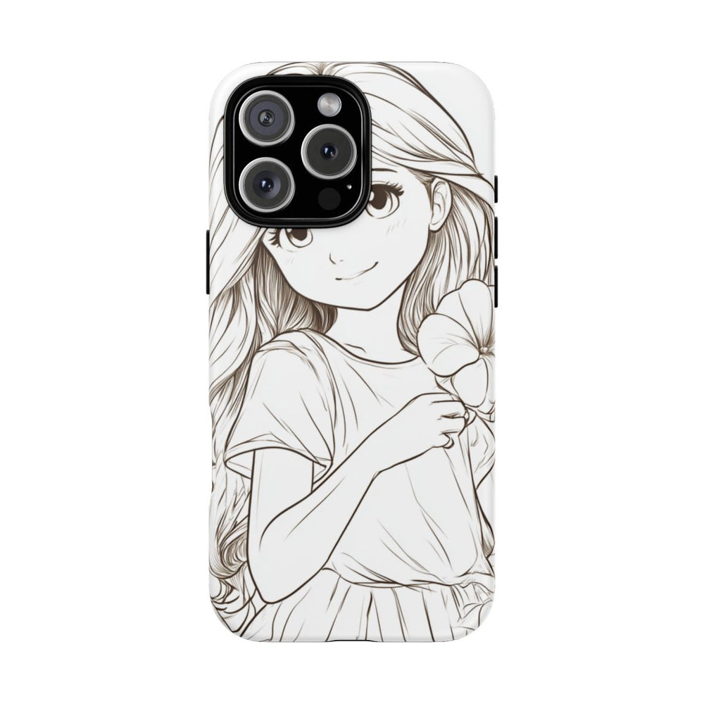 Dit telefoonhoesje is versierd met een lijntekening van een meisje met lang golvend haar dat een winde bloem vasthoudt. De afbeelding is eenvoudig, met dikke lijnen en zonder schaduwen, waardoor het een heldere, cartoonachtige uitstraling krijgt. Rondom het meisje zijn meerdere winde bloemen en bladeren afgebeeld. Het hoesje heeft een dubbele laag met een stevige polycarbonaat buitenkant en een TPU binnenkant, en ondersteunt draadloos opladen.