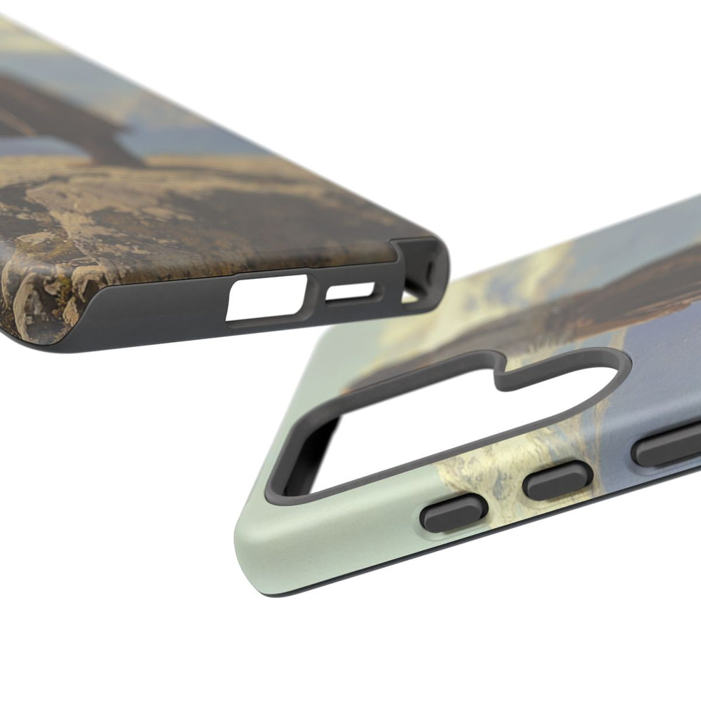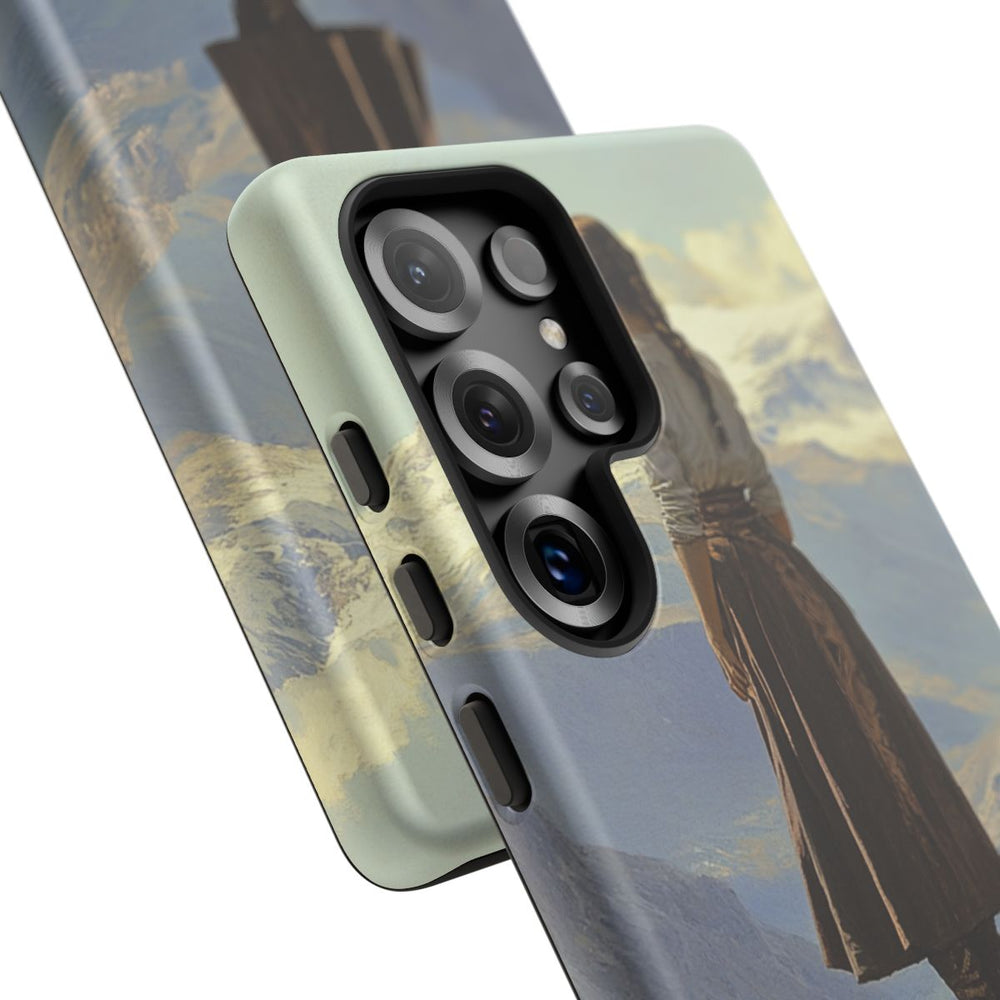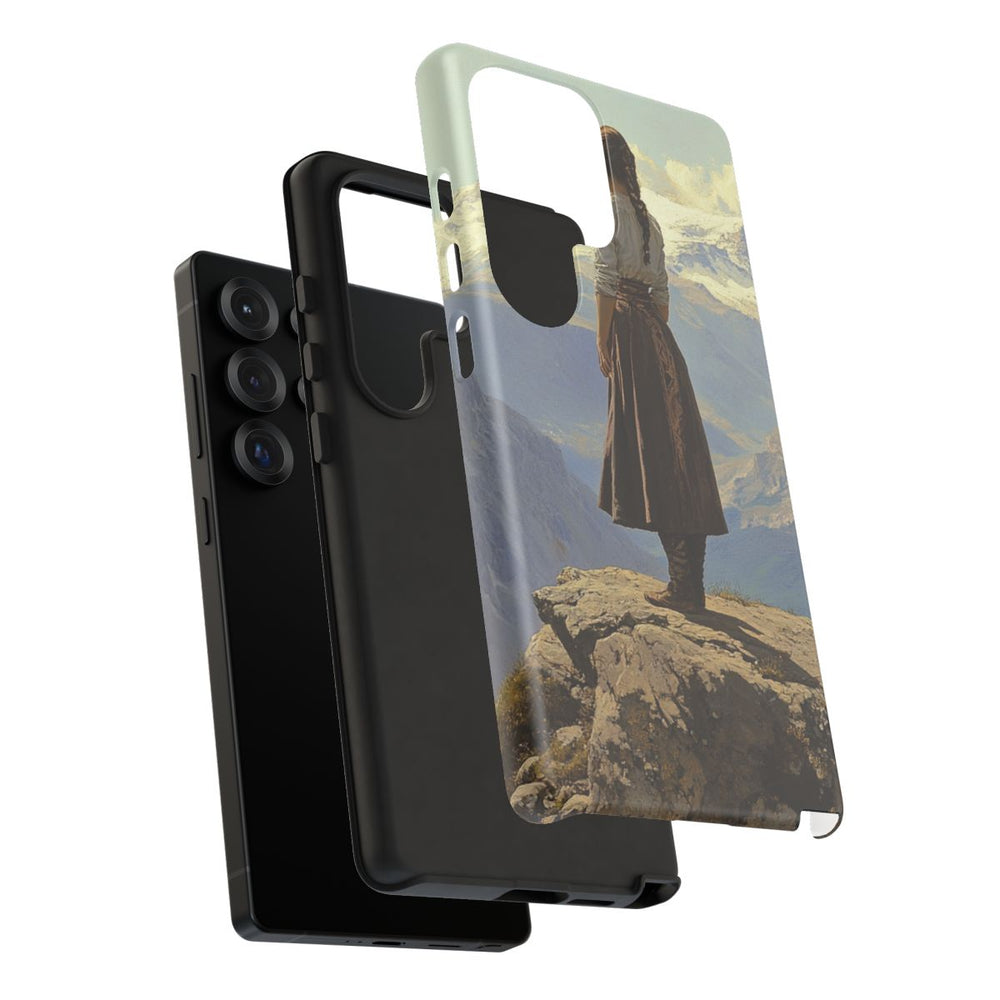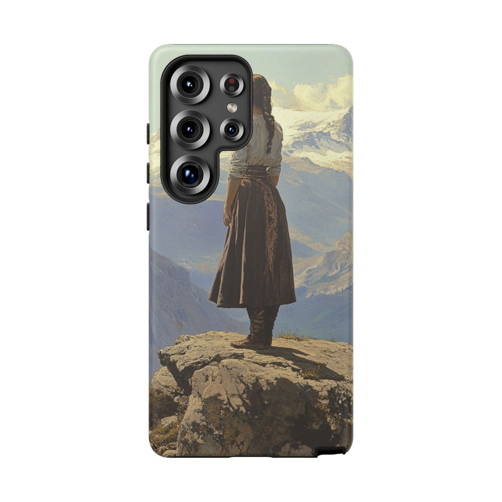 Dit hoesje toont een meisje dat op een rots staat en uitkijkt over uitgestrekte berglandschappen. Ze draagt een lange rok en een witte top, en haar haar is in een vlecht gestyled. Op de achtergrond zijn indrukwekkende, met sneeuw bedekte bergen en een heldere lucht te zien, wat zorgt voor een rustige buitenscène. Het hoesje is gemaakt van 100% polycarbonaat en 100% TPU en heeft een dubbele laag voor extra stevigheid en bescherming. Geschikt voor draadloos opladen, ideaal voor dagelijks gebruik.