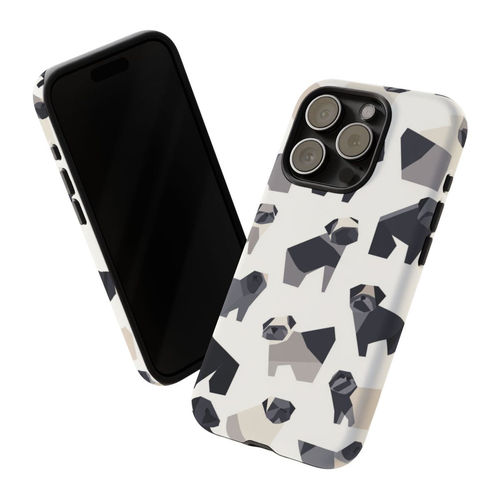Dit hoesje is voorzien van een herhalend patroon met kleine, minimalistische mopshonden in een geometrische stijl. De mopshonden zijn afgebeeld in tinten zwart, grijs en beige op een witte achtergrond. Het patroon is diagonaal gerangschikt zonder overlapping. Het matte, stevige hoesje bestaat uit een polycarbonaat buitenkant en een TPU-binnenzijde, waardoor uw telefoon optimaal wordt beschermd. Ondersteunt draadloos opladen.
