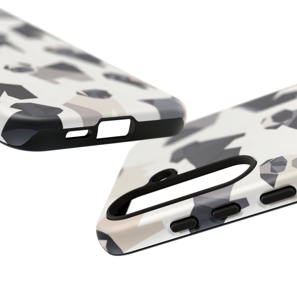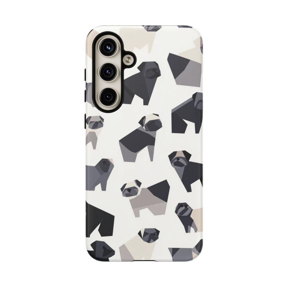 Dit hoesje heeft een herhalend patroon van minimalistische mopshonden in zwarte, grijze en beige tinten. De mopshonden zijn gestileerd met geometrische, hoekige vormen en diagonaal gerangschikt zonder elkaar te overlappen op een witte achtergrond. Het stevige matte hoesje bestaat uit twee lagen, gemaakt van polycarbonaat met een TPU-voering voor extra stevigheid en bescherming. Geschikt voor draadloos opladen. Niet geschikt voor MagSafe.