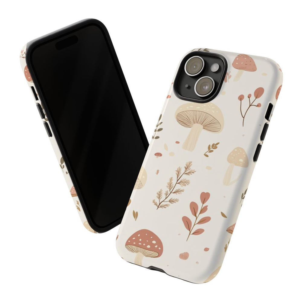 Dit hoesje heeft een herhalend patroon van kleine paddenstoelen en fijne bloemmotieven op een witte achtergrond. De paddenstoelen zijn getekend in zachte beige- en roze tinten met subtiele witte stippen. Rondom de paddenstoelen staan eenvoudige botanische illustraties zoals blaadjes en kleine takjes in bruin, beige en zachtroze. De minimalistische, vectorachtige stijl zorgt voor een rustige en stijlvolle uitstraling. Het hoesje is glanzend en stevig, vervaardigd uit polycarbonaat en TPU, en biedt dubbele bescherming en ondersteuning voor draadloos opladen.