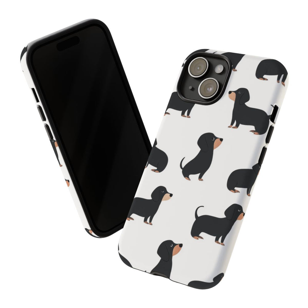 Dit hoesje heeft een strak en eigentijds ontwerp met meerdere kleine zwarte teckels in een nette diagonale patroon op een witte achtergrond. Elke teckel is afgebeeld in een eenvoudige, moderne stijl zonder overlapping. Het hoesje bestaat uit een dubbele laag met een matte afwerking, een stevige polycarbonaat buitenkant en een TPU binnenkant, waardoor het optimale bescherming biedt en geschikt is voor draadloos opladen. Het minimalistische ontwerp is perfect voor liefhebbers van honden.