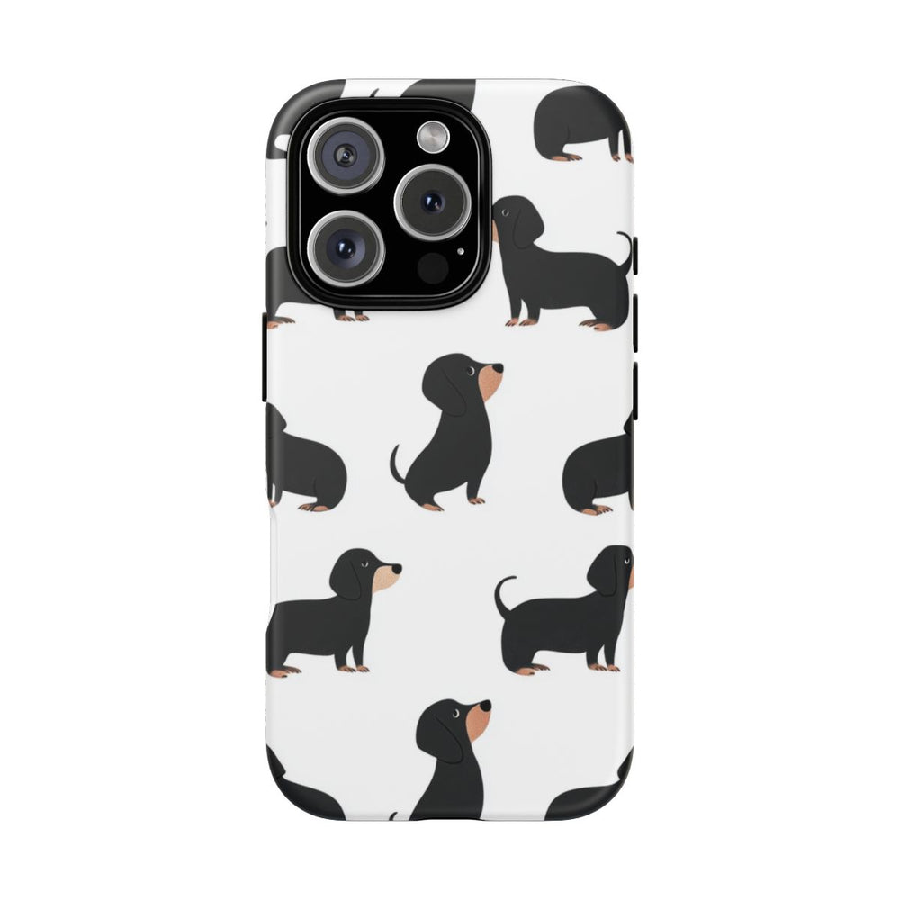 Dit hoesje is voorzien van een patroon met meerdere kleine, minimalistische zwarte teckels die diagonaal over een witte achtergrond zijn gerangschikt. Elke teckel is afgebeeld in een eenvoudige, moderne stijl zonder overlappende elementen. Het hoesje bestaat uit twee lagen met een stevige polycarbonaat buitenkant en een TPU-binnenzijde voor extra stevigheid en bescherming. Ondersteunt draadloos opladen, maar is niet geschikt voor MagSafe.