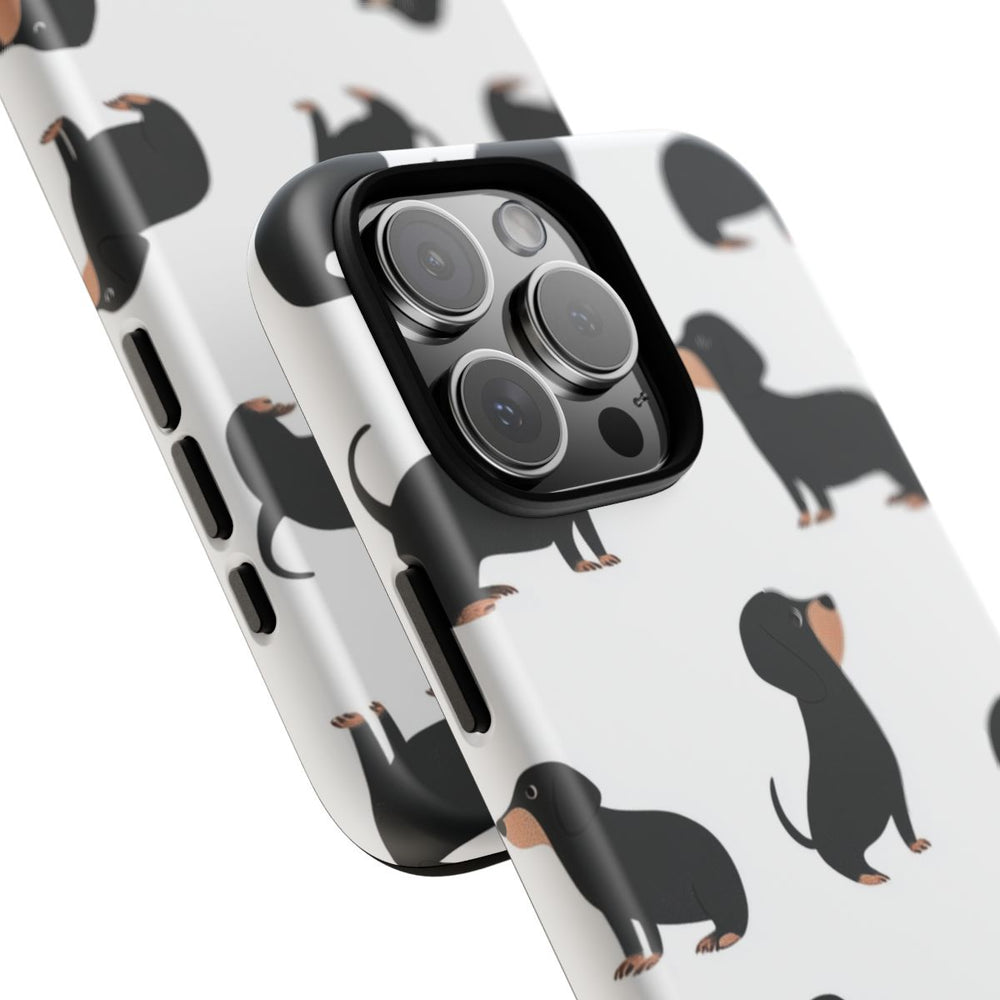 Dit telefoonhoesje heeft een stijlvol patroon van minimalistische zwarte teckels op een witte achtergrond. Elke teckel is afgebeeld in een modern, eenvoudig ontwerp met strakke lijnen, zonder overlappingen. Het matte hoesje bestaat uit een stevige polycarbonaat buitenkant en een TPU-binnenzijde voor dubbele bescherming. Het hoesje ondersteunt draadloos opladen en is bestand tegen weersinvloeden.