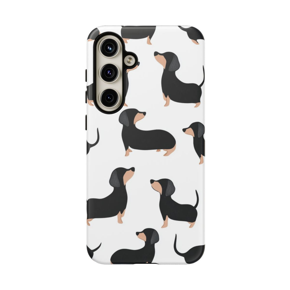 Dit hoesje is voorzien van een herhalend patroon van minimalistische zwarte teckels op een witte achtergrond. Elke teckel is afgebeeld in een eenvoudige, moderne stijl zonder overlappingen. Het hoesje bestaat uit twee lagen van polycarbonaat en TPU voor extra stevigheid en bescherming. Geschikt voor draadloos opladen en bestand tegen invloeden van buitenaf.