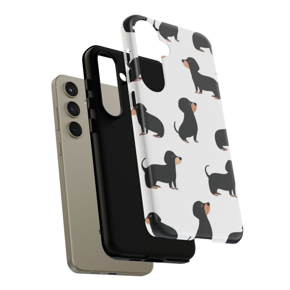 Dit hoesje is voorzien van meerdere minimalistische illustraties van zwarte teckels, diagonaal gerangschikt op een witte achtergrond. Elke teckel is afgebeeld in een eenvoudige, moderne stijl met subtiele details zoals ogen, oren en pootjes in lichtbruine tinten. Het matte, stevige hoesje bestaat uit een dubbele laag van polycarbonaat en TPU voor extra bescherming en ondersteunt draadloos opladen. Het frisse en speelse patroon is perfect voor liefhebbers van honden.