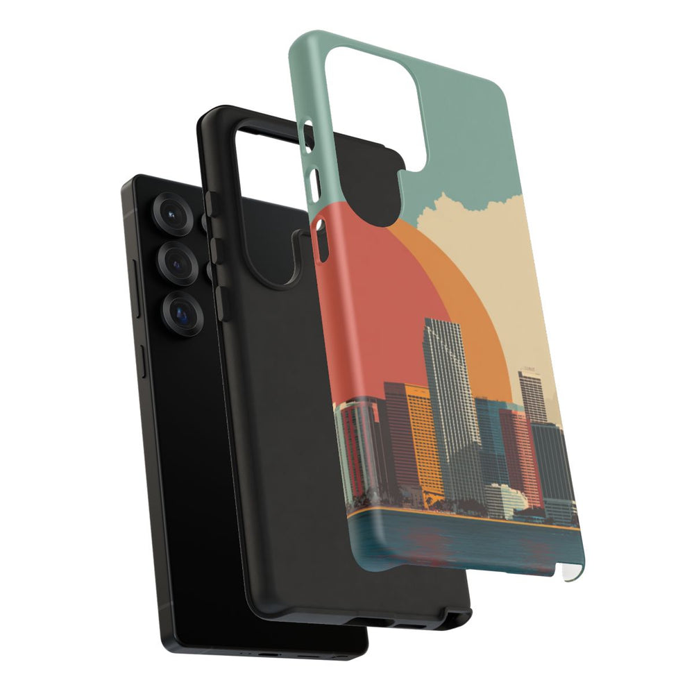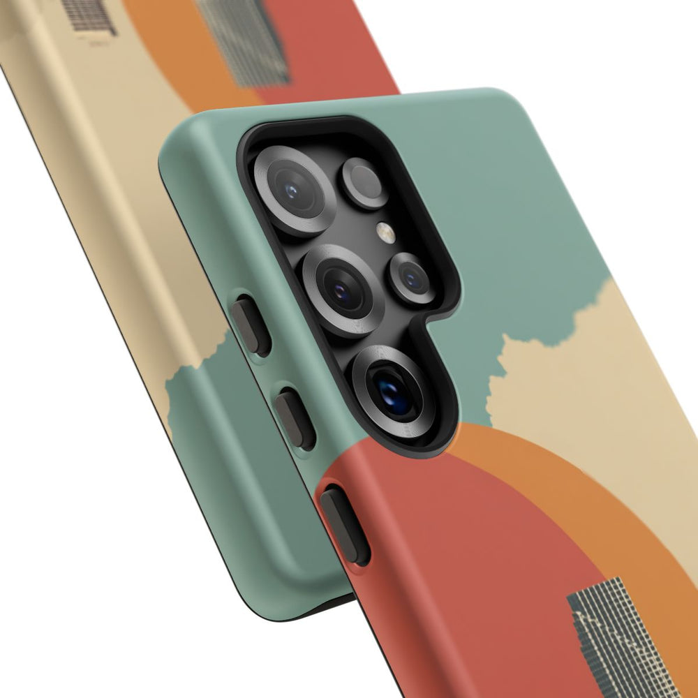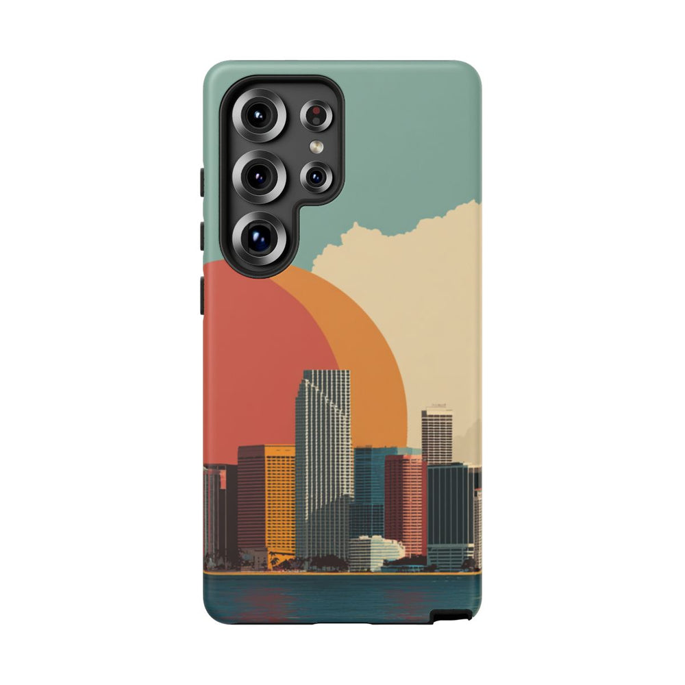 Dit hoesje is voorzien van een gestileerde skyline met hoge gebouwen in een eenvoudige, minimalistische vectorstijl. De gebouwen zijn uitgevoerd in diverse kleuren, waaronder tinten oranje, rood, blauw en wit. Achter de stad prijkt een grote, overlappende cirkelvormige zon in oranje en rode tinten. De lucht heeft een gedempte teal kleur met een grote wolk in crème. Het water op de voorgrond weerspiegelt de kleuren van de lucht en de gebouwen. Het hoesje bestaat uit twee lagen met een matte afwerking en is gemaakt van polycarbonaat en TPU. Dit zorgt voor extra stevigheid en bescherming, en maakt het hoesje geschikt voor draadloos opladen.