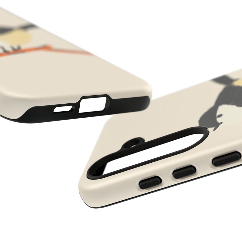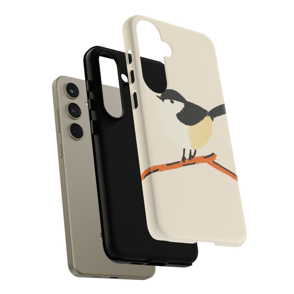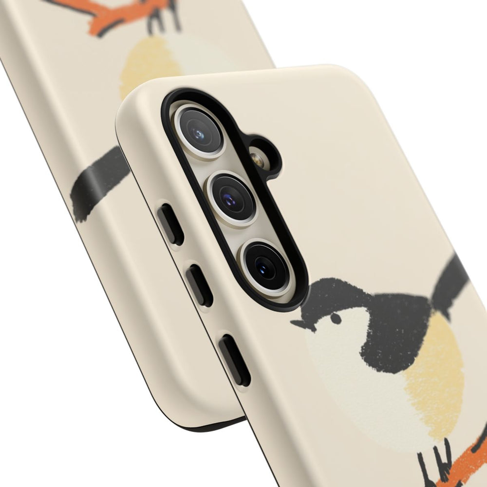 Dit hoesje heeft een eenvoudige, handgeschilderde vogel die op een kleine tak zit. De vogel heeft een zwarte kop, staart en vleugels, een crèmekleurig gezicht en buik, en een lichtgeel accent aan de zijkant. De tak is oranje met zwarte details. De achtergrond is zacht beige. Het hoesje is gemaakt van polycarbonaat met een TPU-voering en biedt dubbele bescherming. Geschikt voor draadloos opladen.