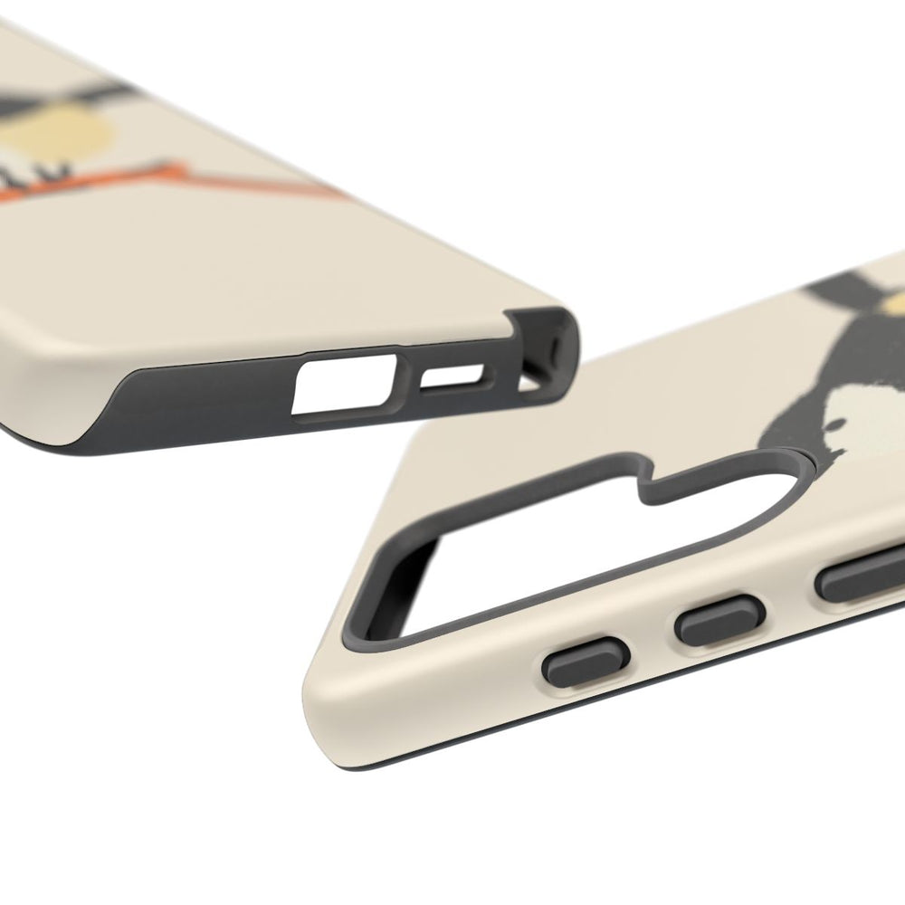 Dit hoesje heeft een eenvoudig, handgeschilderd ontwerp van een vogel die op een kleine tak zit. De vogel heeft een zwarte kop, staart en bovenzijde, met een crèmekleurig gezicht en een lichtgele buik. De tak is oranje met zwarte accenten. De achtergrond is zacht crème, wat zorgt voor een minimalistische en speelse uitstraling. Het hoesje bestaat uit twee lagen van polycarbonaat en TPU, biedt extra bescherming en ondersteunt draadloos opladen.