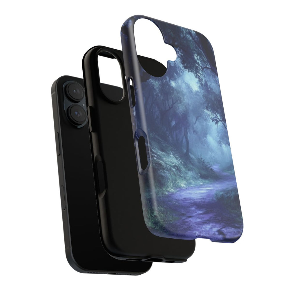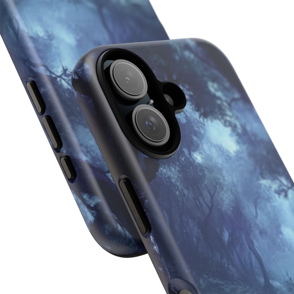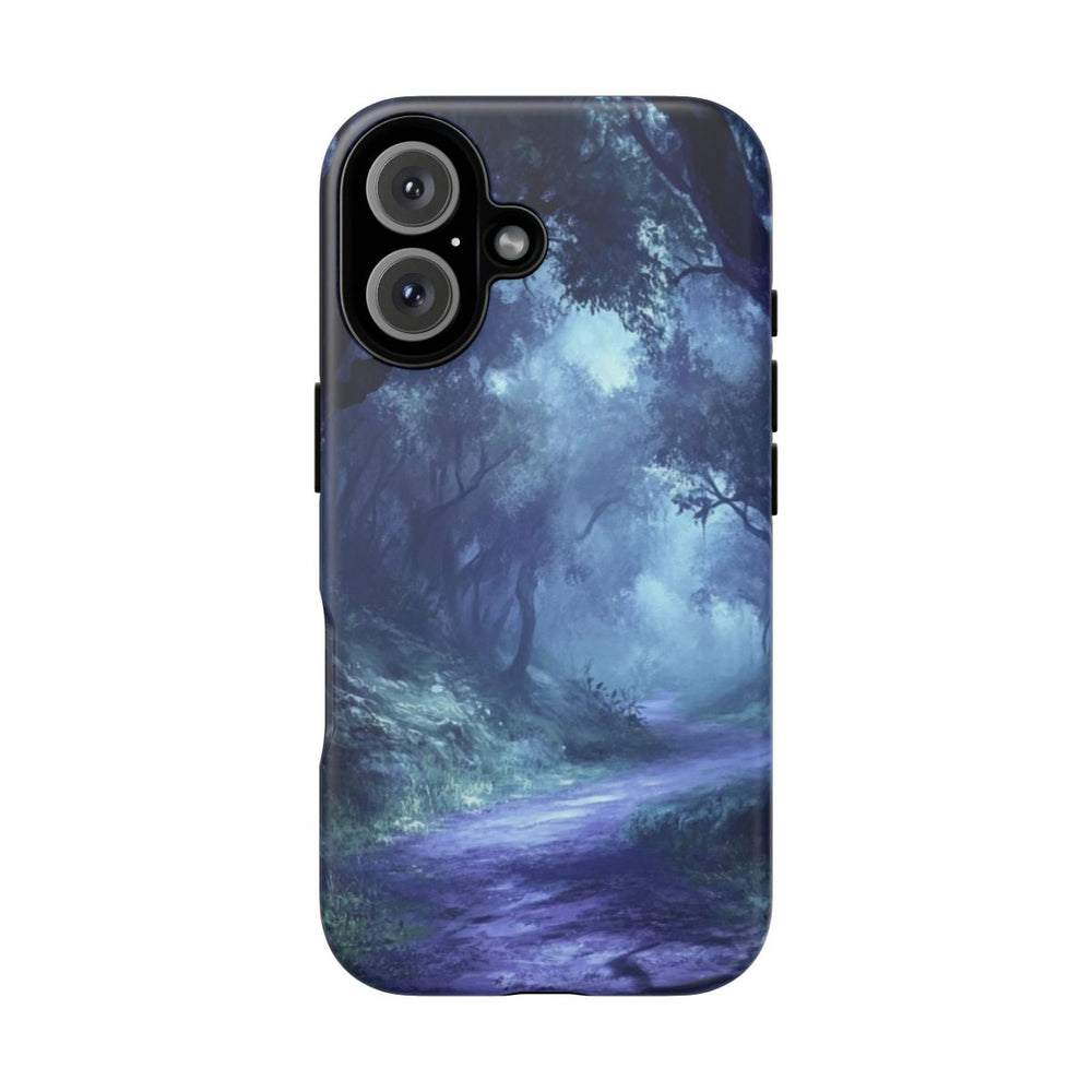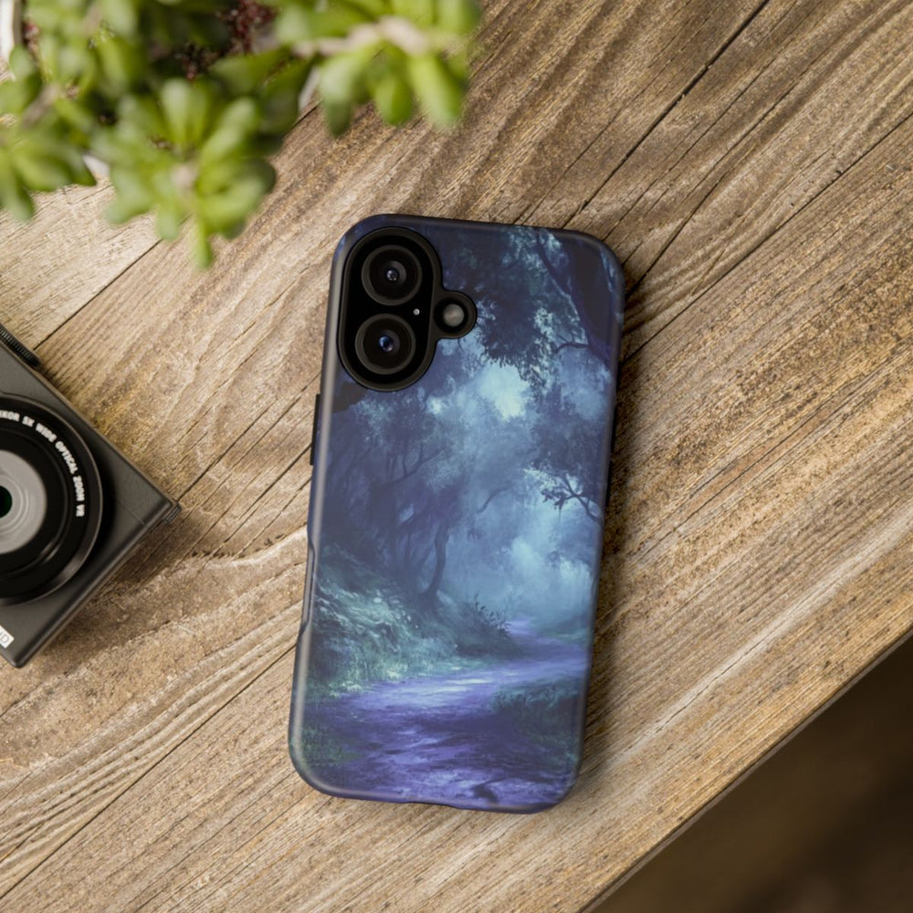 Dit ontwerp toont een mistig bospaadje, omringd door hoge, donkere bomen met kronkelende takken. De scène is gehuld in een blauwe schemering, wat zorgt voor een mysterieuze en licht onheilspellende sfeer. Het pad slingert rustig door het dichte bos, met hier en daar gras en bladeren langs de randen. Het hoesje bestaat uit twee lagen met een matte afwerking en is gemaakt van polycarbonaat en TPU, voor extra bescherming en geschikt voor draadloos opladen.