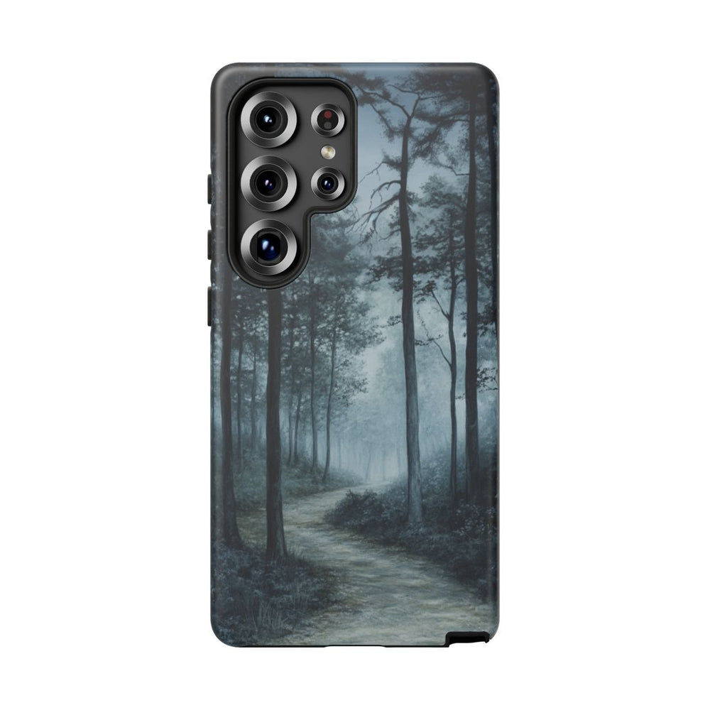 Dit hoesje is voorzien van een ontwerp met een slingerend pad dat door een dicht bos loopt, omgeven door hoge bomen aan weerszijden. De scène is gehuld in een mysterieuze mist, wat zorgt voor een kalme en geheimzinnige sfeer. Blauwe en grijze tinten overheersen en versterken het nevelige, serene gevoel. Het hoesje heeft een dubbele laag van polycarbonaat en TPU voor extra bescherming en is geschikt voor draadloos opladen.