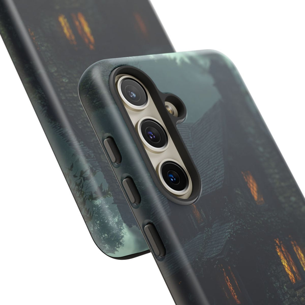Dit hoesje toont een gotisch stenen huisje, omgeven door een dicht bos en nevel. Het huisje heeft een steil leistenen dak, een grote stenen schoorsteen waar rook uit opstijgt, en meerdere ramen die warm oplichten van binnenuit. Klimop en ranken groeien langs de stenen muren, waardoor het huisje opgaat in de natuurlijke omgeving. De scène is sfeervol en mysterieus door het gedempte licht. Het matte, stevige telefoonhoesje is gemaakt van polycarbonaat en TPU en biedt uitstekende bescherming en duurzaamheid, ook bij buitengebruik. Geschikt voor de Galaxy S24.
