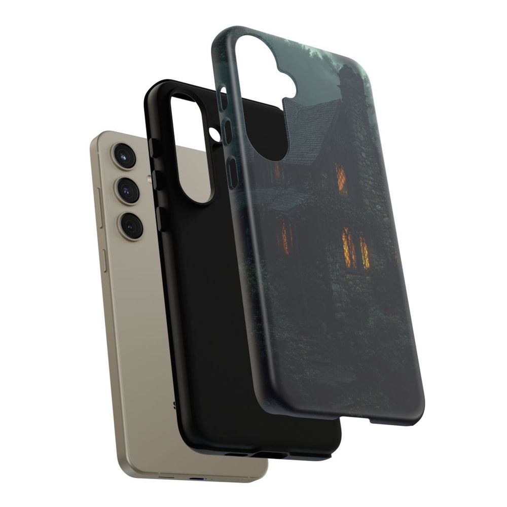 Dit hoesje toont een gotisch stenen huisje, omringd door dicht bos en zware mist. Het huisje heeft een steil leistenen dak, een hoge stenen schoorsteen waar rook uit komt, en meerdere ramen die warm oplichten. Klimop en ander groen groeien langs de stenen muren, waardoor het huisje opgaat in de natuurlijke omgeving. De sfeer is mysterieus en sfeervol, vastgelegd in zacht, mistig licht. Het hoesje bestaat uit twee lagen met een stevige polycarbonaat buitenkant en een TPU binnenzijde, wat zorgt voor extra bescherming en ondersteuning van draadloos opladen.
