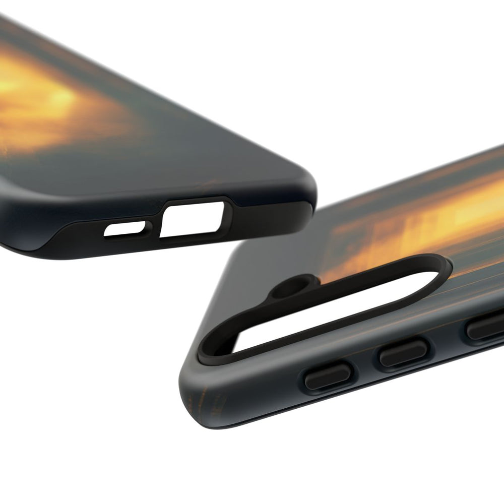 Dit telefoonhoesje toont een lange, smalle gang met meerdere deuropeningen langs de wanden. Aan het einde van de gang schijnt een warme gouden lichtstraal naar binnen, waardoor zachte schaduwen ontstaan en de nevel in de gang wordt verlicht. De muren en vloer hebben een doorleefde, getextureerde uitstraling, met donkere tinten die afsteken tegen het heldere licht. Het hoesje bestaat uit twee lagen van polycarbonaat en TPU en is ontworpen voor stevigheid en ondersteuning van draadloos opladen.