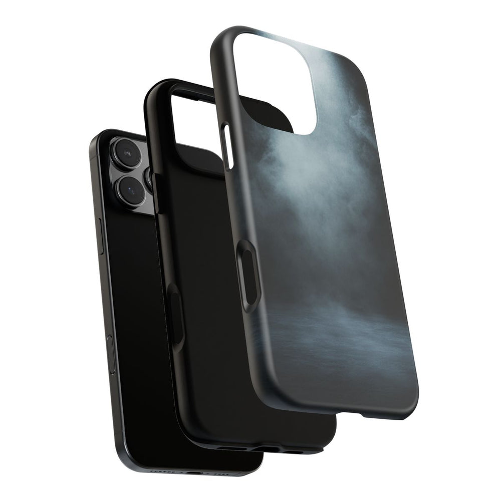 Dit hoesje toont een sfeervolle scène met een zachte, heldere spotlight die van bovenaf op een getextureerd oppervlak schijnt. Rondom het licht zweeft een subtiele mist of rook, waardoor het licht diffuus wordt en er een mysterieuze, minimalistische sfeer ontstaat. De achtergrond is overwegend donker, wat het contrast en de aandacht op het verlichte deel versterkt. Het hoesje bestaat uit twee lagen met een matte afwerking van polycarbonaat en TPU, en is ontworpen voor extra stevigheid en ondersteuning van draadloos opladen.