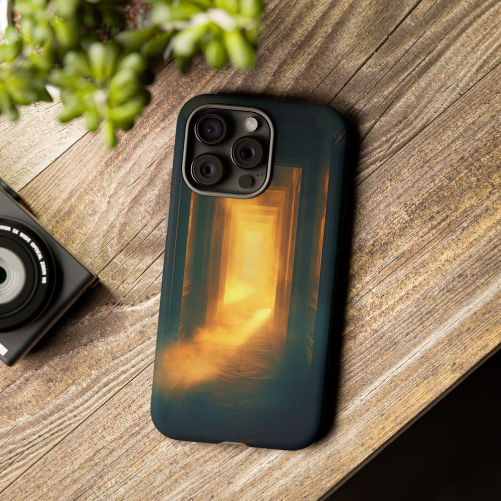 Dit hoesje toont een lange, smalle gang met meerdere deuropeningen. Aan het einde straalt een warme, gouden gloed fel, waardoor zachte schaduwen ontstaan en de nevel in de gang wordt verlicht. De muren en vloer hebben een donkere, getextureerde uitstraling die mooi afsteekt tegen het licht en de mist. Het hoesje bestaat uit twee lagen met een polycarbonaat buitenkant en een TPU binnenzijde. Het is stevig, bestand tegen gebruik buitenshuis en geschikt voor draadloos opladen.