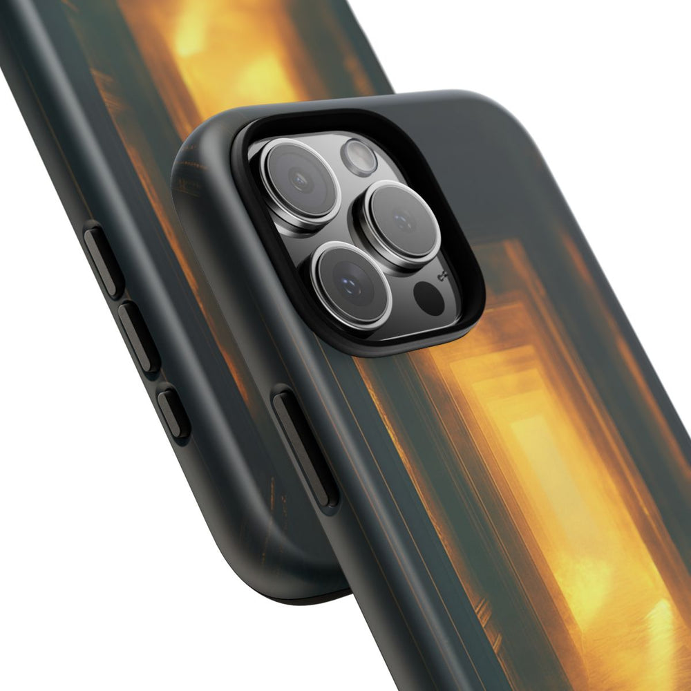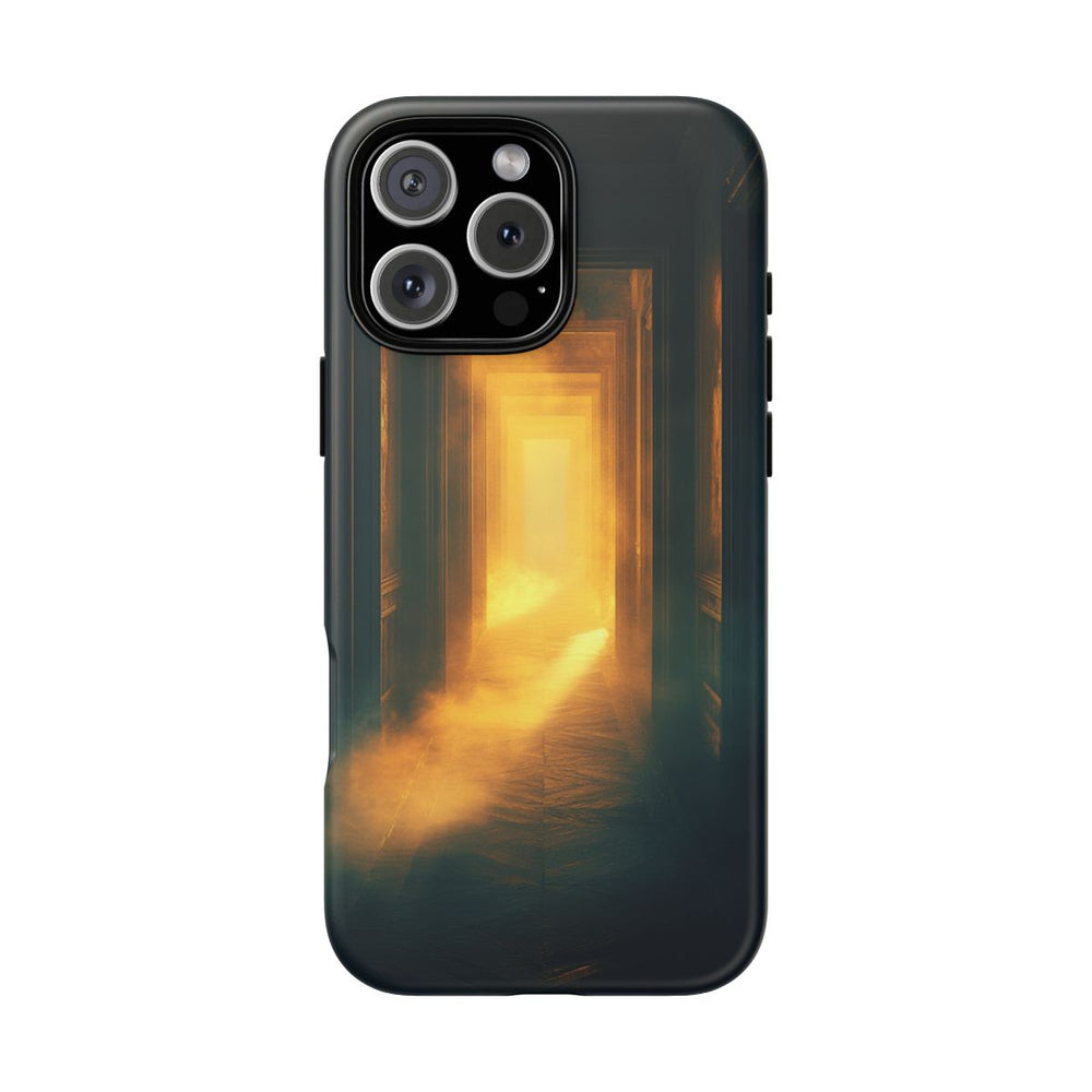 Dit hoesje toont een donkere gang met meerdere deuropeningen die in perspectief zijn uitgelijnd. Aan het einde straalt warm, goudkleurig licht, waardoor zachte schaduwen ontstaan en de wervelende mist op de vloer en in de gang wordt verlicht. De muren en vloer zijn rijk aan textuur, wat zorgt voor een mysterieuze en sfeervolle uitstraling. Het hoesje bestaat uit twee lagen: een stevige polycarbonaat buitenkant en een TPU-binnenzijde. Ondersteunt draadloos opladen.