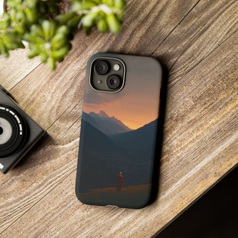 Dit hoesje toont een alleenstaande figuur in een dieporanje gewaad op een grasrijke helling in een rustig bergdal. De scène speelt zich af vlak voor zonsopkomst, waarbij donkere bergen het dal omringen en een zachte gouden gloed aan de horizon verschijnt. De deels bewolkte lucht versterkt de serene en contemplatieve sfeer. Het matte, stevige hoesje is vervaardigd uit duurzame polycarbonaat- en TPU-lagen en biedt optimale bescherming, terwijl draadloos opladen gewoon mogelijk blijft.