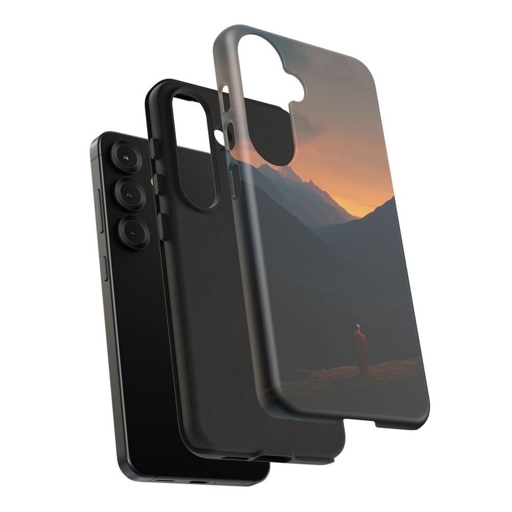 Dit hoesje toont een alleenstaande figuur in een dieporanje gewaad op een grasrijke helling in een rustig bergdal. De scène speelt zich af vlak voor zonsopkomst, waarbij donkere bergen het dal omringen en een zachte gouden gloed aan de horizon verschijnt. De deels bewolkte lucht versterkt de serene en contemplatieve sfeer. Het matte, stevige hoesje is vervaardigd uit duurzame polycarbonaat- en TPU-lagen en biedt optimale bescherming, terwijl draadloos opladen gewoon mogelijk blijft.