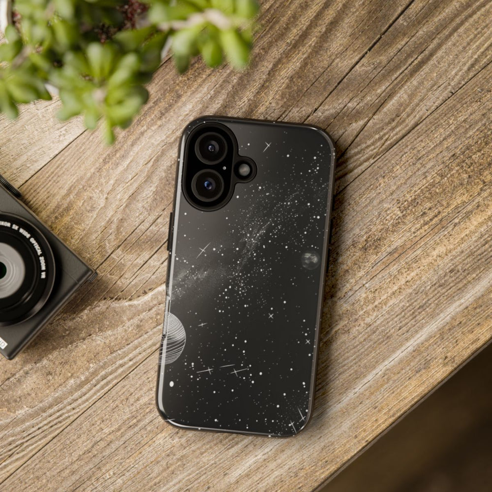 Dit ontwerp toont een monochrome weergave van een zonnestelsel op een zwarte achtergrond. Witte stippen en lijnen stellen sterren en planeten voor, verspreid over een patroon met een ruimtethema. Diverse planeten, waaronder exemplaren met ringen, zijn afgebeeld met fijne witte lijnen en schaduwen. De afbeelding is gedrukt op een glanzend, stevig hoesje van polycarbonaat en TPU, dat een dubbele laag bescherming biedt en geschikt is voor draadloos opladen. Het geheel heeft een minimalistische en kosmische uitstraling.