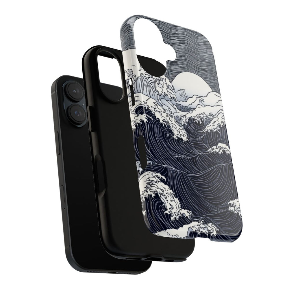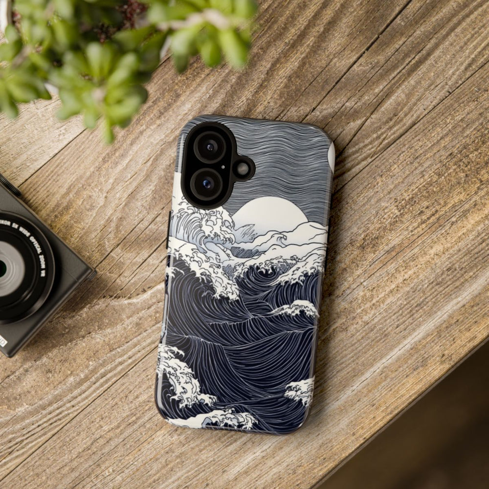 Dit hoesje heeft een gedetailleerde zwart-wit illustratie van oceaangolven onder een volle maan. De golven zijn vormgegeven met verfijnde lijnpatronen, wat zorgt voor een levendig en textuurrijk effect. Op de achtergrond is een golvend patroon in de lucht te zien, dat mooi aansluit bij de dynamische zee. Het hoesje is glanzend en stevig, met een buitenkant van polycarbonaat en een TPU-binnenkant voor dubbele bescherming. Ondersteunt draadloos opladen. Het ontwerp is artistiek en opvallend in zwart-wit.