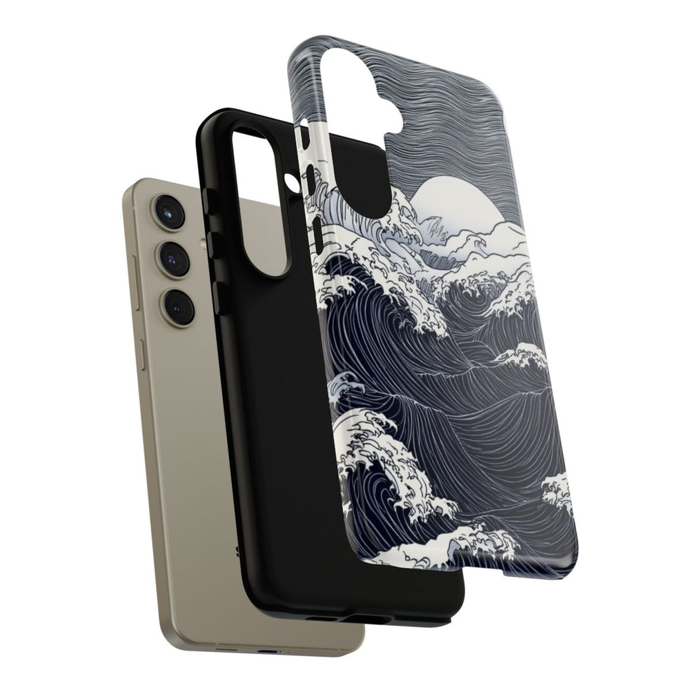 Dit hoesje heeft een gedetailleerde zwart-wit illustratie van oceaangolven onder een volle maan. De golven zijn vormgegeven met verfijnde lijnpatronen, wat zorgt voor een levendig en textuurrijk effect. Op de achtergrond is een golvend patroon in de lucht te zien, dat mooi aansluit bij de dynamische zee. Het hoesje is glanzend en stevig, met een buitenkant van polycarbonaat en een TPU-binnenkant voor dubbele bescherming. Ondersteunt draadloos opladen. Het ontwerp is artistiek en opvallend in zwart-wit.