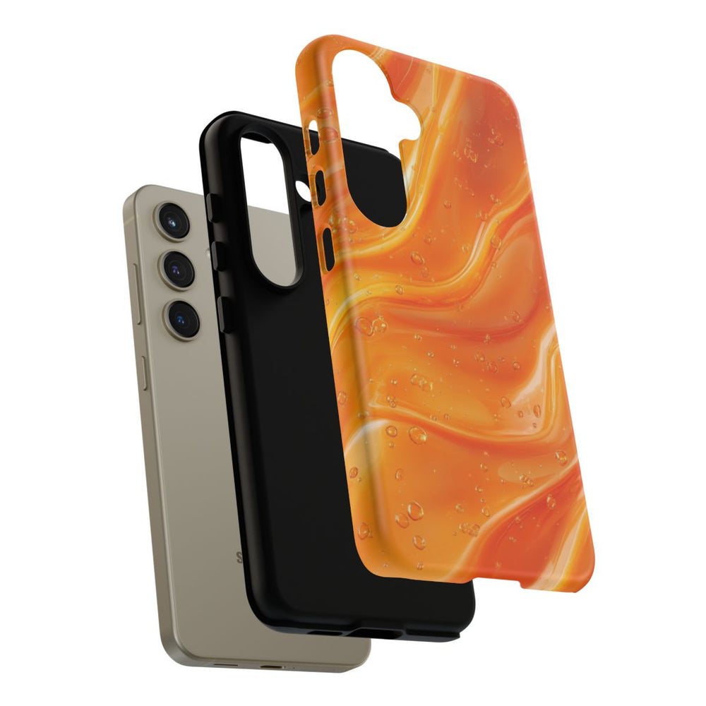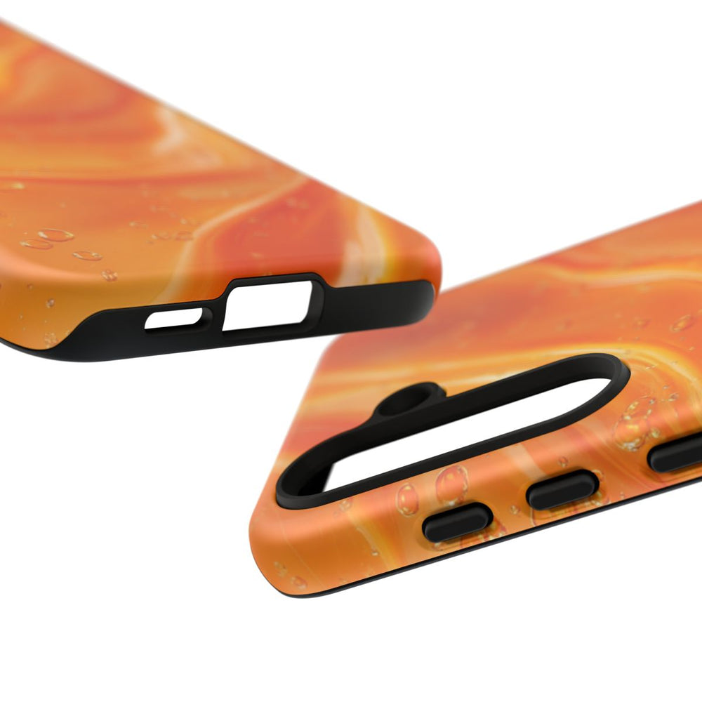 Dit hoesje heeft een opvallende, oranje achtergrond met een vloeiend golfpatroon. De glanzende uitstraling en verspreide luchtbellen zorgen voor een dynamisch en levendig effect. Het stevige materiaal beschermt je toestel optimaal en ondersteunt draadloos opladen, waardoor het hoesje ideaal is voor dagelijks gebruik. Perfect voor liefhebbers van felle kleuren en vloeiende designs.