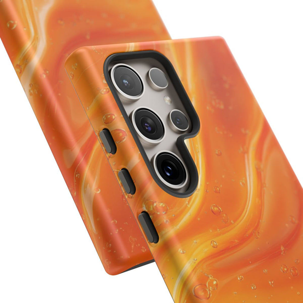Dit telefoonhoesje heeft een levendige, oranje achtergrond met een vloeibaar ogend effect. De glanzende oppervlakte toont zachte golven en luchtbelletjes, wat zorgt voor een dynamisch en speels uiterlijk. Ideaal voor liefhebbers van opvallende kleuren en bijzondere texturen. Het hoesje is gemaakt van 100% polycarbonaat en 100% TPU en biedt dankzij de dubbele laag uitstekende bescherming. Ondersteunt draadloos opladen en is daardoor extra praktisch in het dagelijks gebruik.