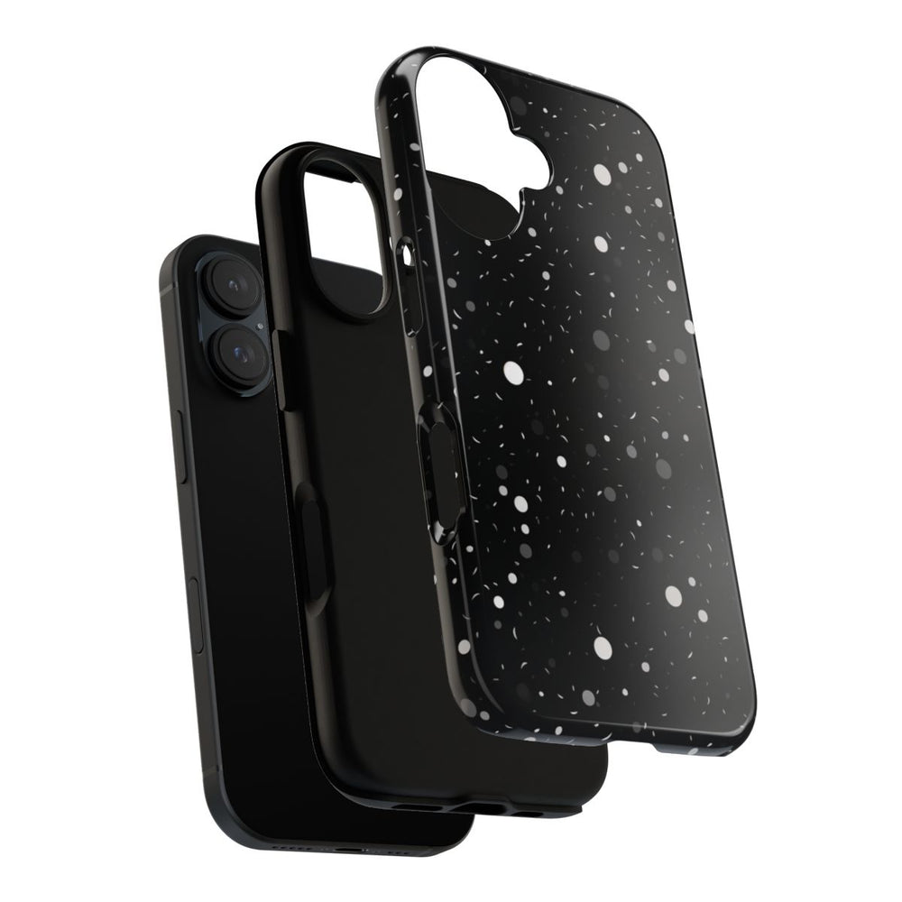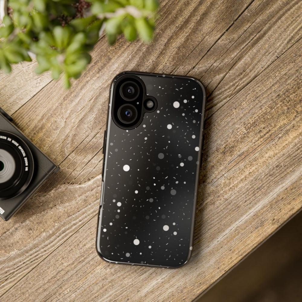 Dit hoesje heeft een minimalistisch ontwerp met een ruimteachtige textuur op een zwarte achtergrond, bezaaid met witte en grijze stippen in verschillende formaten. Fijne, gebogen lijnen draaien subtiel rond de stippen en geven het geheel een lichte beweging en diepte. Het monochrome uiterlijk met weinig kleurverschil zorgt voor een strakke en moderne uitstraling. Het hoesje is glanzend en stevig dankzij de dubbele laag materialen, biedt uitstekende bescherming, ondersteunt draadloos opladen en is bestand tegen intensief gebruik, ook buitenshuis.