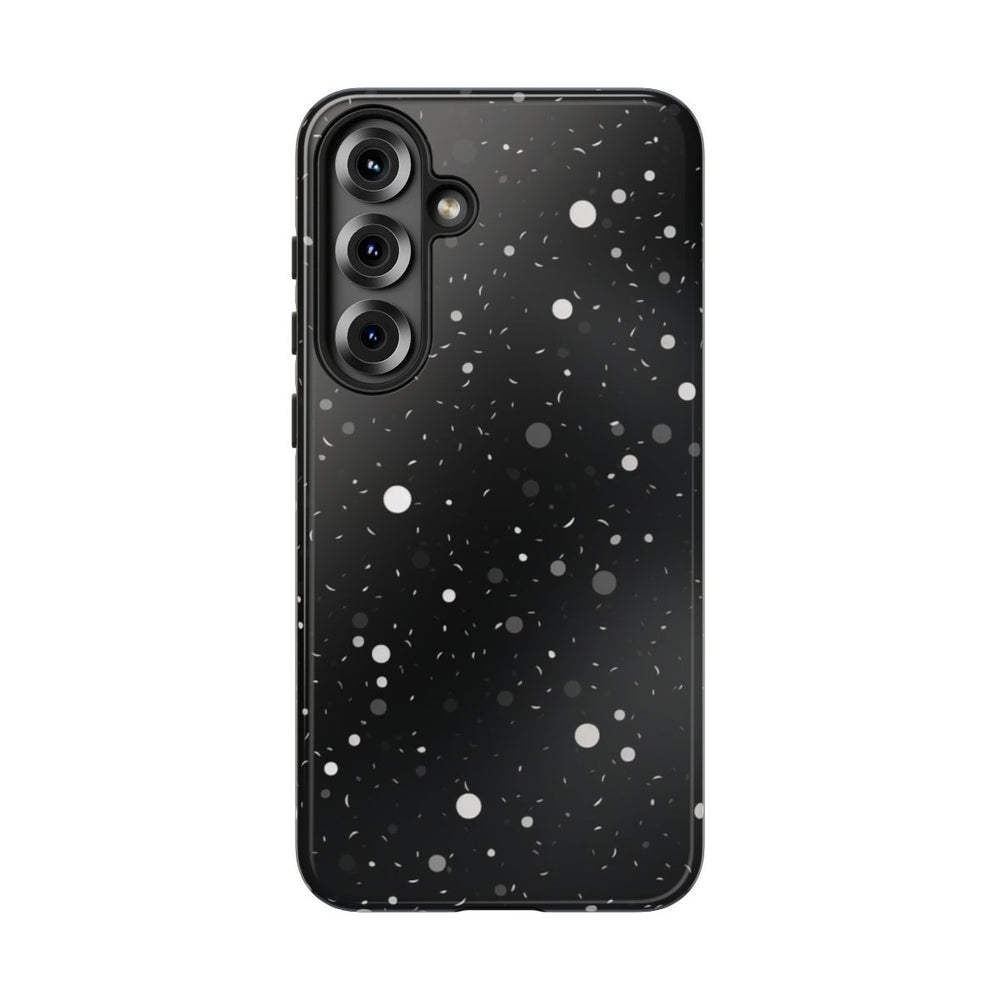 Dit hoesje heeft een minimalistisch ontwerp met een ruimteachtige textuur op een zwarte achtergrond, bezaaid met witte en grijze stippen in verschillende formaten. Fijne, gebogen lijnen draaien subtiel rond de stippen en geven het geheel een lichte beweging en diepte. Het monochrome uiterlijk met weinig kleurverschil zorgt voor een strakke en moderne uitstraling. Het hoesje is glanzend en stevig dankzij de dubbele laag materialen, biedt uitstekende bescherming, ondersteunt draadloos opladen en is bestand tegen intensief gebruik, ook buitenshuis.