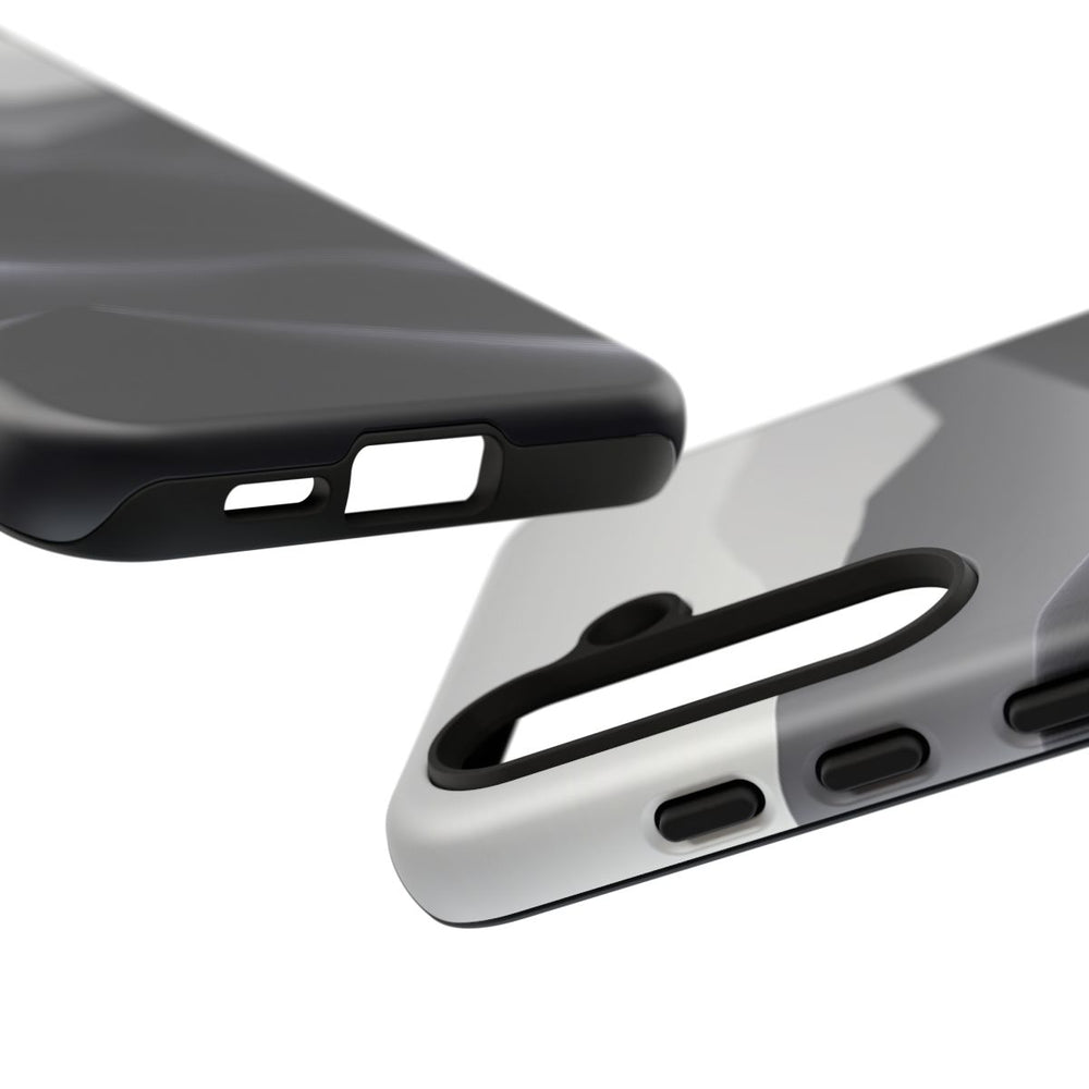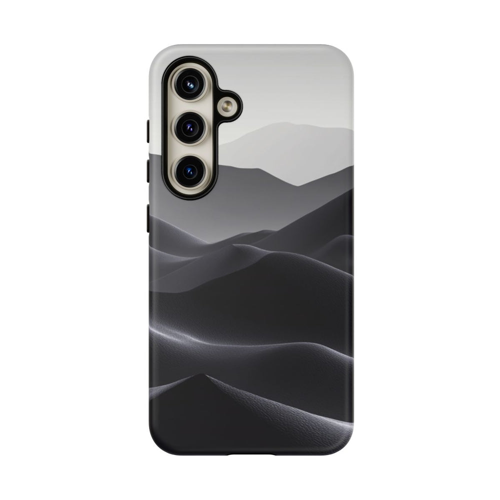 Dit ontwerp toont een monochroom berglandschap met vloeiende, golvende vormen die doen denken aan duinen of heuvels in donkergrijze en zwarte tinten. Op de achtergrond zijn lichtere grijze bergen zichtbaar die vervagen in een zachte, geleidelijke lucht. De afbeelding is gedrukt op een mat telefoonhoesje met een stevige buitenkant van polycarbonaat en een binnenzijde van TPU. Dit hoesje biedt dubbele bescherming en ondersteunt draadloos opladen, maar is niet geschikt voor MagSafe.