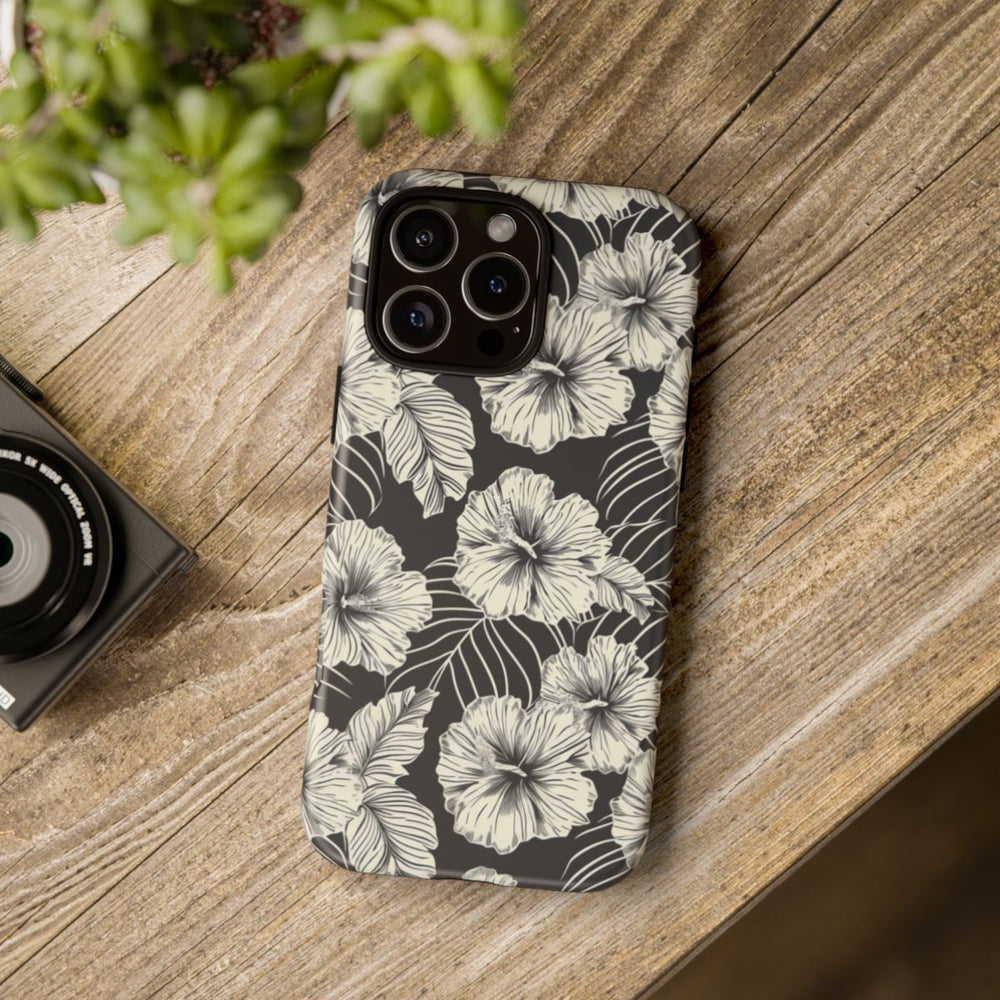 Dit hoesje is voorzien van een herhalend patroon met grote, gedetailleerde hibiscusbloemen en tropische bladeren in een monochroom kleurenschema. De bloemen en bladeren zijn fijn getekend met subtiele lijnen en schaduwen, wat zorgt voor een verfijnde en elegante uitstraling. De donkere achtergrond vormt een mooi contrast met de lichte bloemelementen, waardoor deze extra opvallen. Het patroon is gedrukt op een mat hoesje van polycarbonaat en TPU, dat bestaat uit twee lagen voor optimale bescherming en geschikt is voor draadloos opladen.