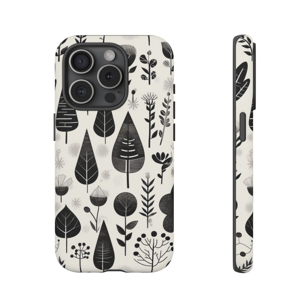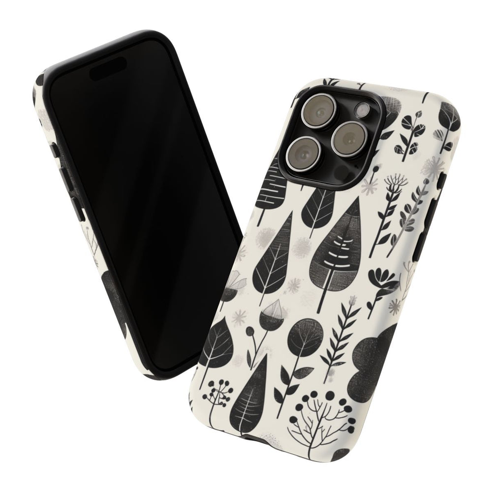 Dit telefoonhoesje is voorzien van een herhalend patroon van gestileerde botanische elementen, zoals bladeren, bloemen en takken. Het ontwerp is uitgevoerd in zwart en grijstinten op een witte achtergrond, wat zorgt voor een minimalistische en moderne uitstraling. De verschillende bladvormen en bloemdetails zijn afgebeeld met eenvoudige lijnen en subtiele textuur. Het matte hoesje is gemaakt van polycarbonaat en TPU en biedt een dubbele beschermlaag. Geschikt voor draadloos opladen.