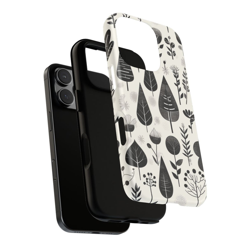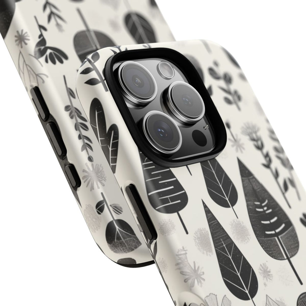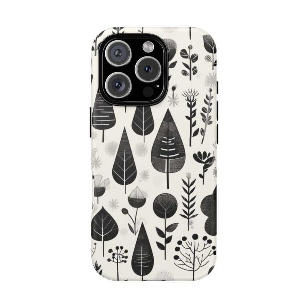 Dit telefoonhoesje is voorzien van een herhalend patroon van gestileerde botanische elementen, zoals bladeren, bloemen en takken. Het ontwerp is uitgevoerd in zwart en grijstinten op een witte achtergrond, wat zorgt voor een minimalistische en moderne uitstraling. De verschillende bladvormen en bloemdetails zijn afgebeeld met eenvoudige lijnen en subtiele textuur. Het matte hoesje is gemaakt van polycarbonaat en TPU en biedt een dubbele beschermlaag. Geschikt voor draadloos opladen.