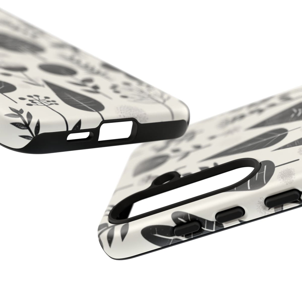 Dit telefoonhoesje is voorzien van een herhalend patroon van gestileerde botanische elementen, zoals bladeren, bloemen en takken. Het ontwerp is uitgevoerd in zwart en grijstinten op een witte achtergrond, wat zorgt voor een minimalistische en moderne uitstraling. De verschillende bladvormen en bloemdetails zijn afgebeeld met eenvoudige lijnen en subtiele textuur. Het matte hoesje is gemaakt van polycarbonaat en TPU en biedt een dubbele beschermlaag. Geschikt voor draadloos opladen.