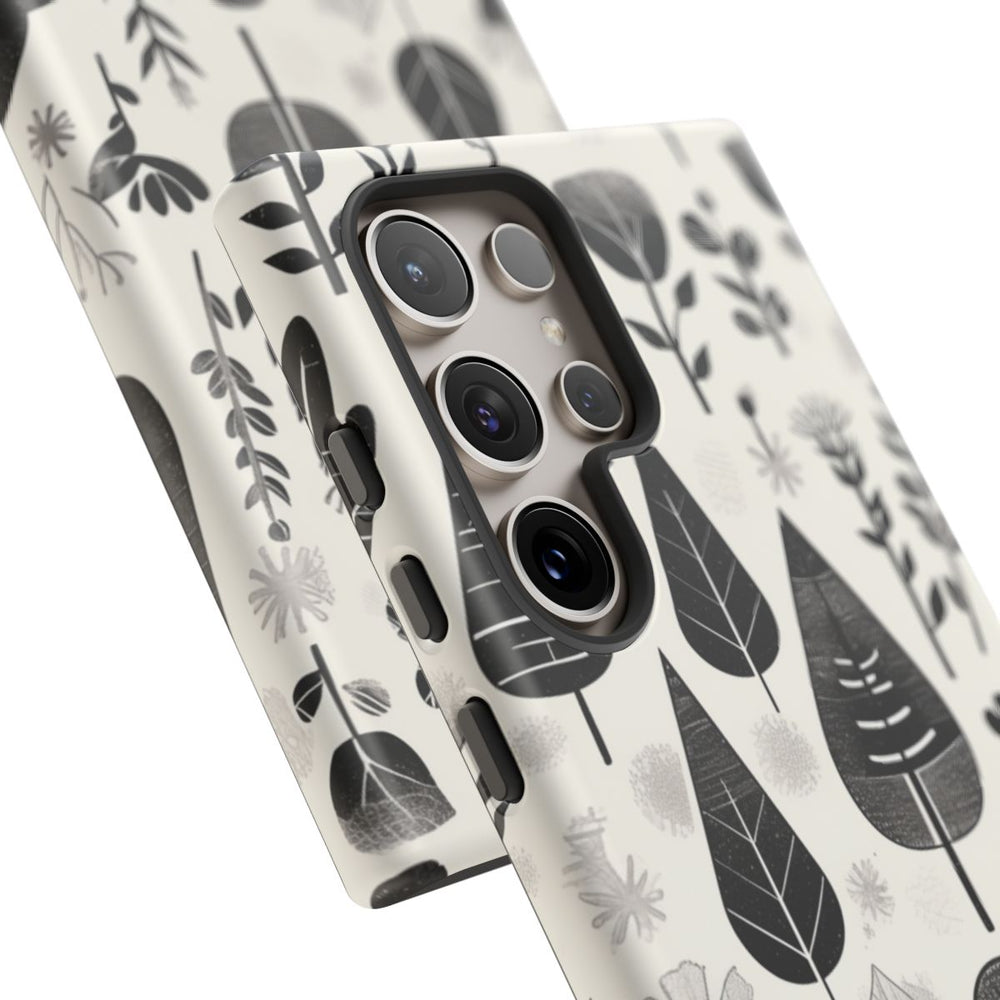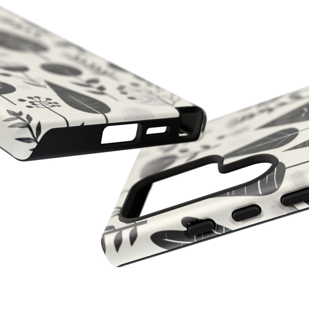 Dit telefoonhoesje is voorzien van een herhalend patroon van gestileerde botanische elementen, zoals bladeren, bloemen en takken. Het ontwerp is uitgevoerd in zwart en grijstinten op een witte achtergrond, wat zorgt voor een minimalistische en moderne uitstraling. De verschillende bladvormen en bloemdetails zijn afgebeeld met eenvoudige lijnen en subtiele textuur. Het matte hoesje is gemaakt van polycarbonaat en TPU en biedt een dubbele beschermlaag. Geschikt voor draadloos opladen.