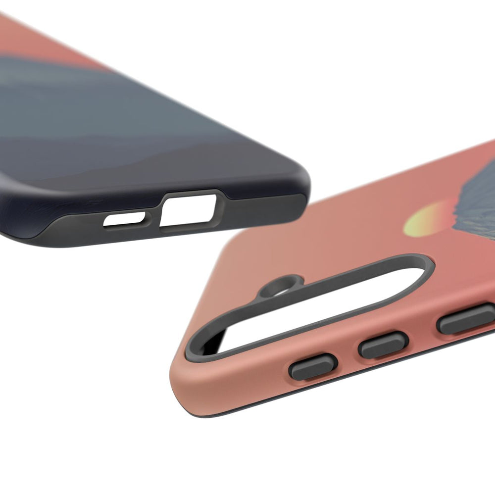 Dit ontwerp toont een gestileerde weergave van de berg Fuji, waarbij de kenmerkende vorm afsteekt tegen een levendige zonsondergang. De ondergaande zon achter de berg kleurt de horizon in warme tinten oranje en roze. Op de voorgrond zijn subtiele silhouetten van verre heuvels te zien, wat het rustige landschap versterkt. Dit telefoonhoesje heeft een dubbele laag voor extra stevigheid en bescherming, en ondersteunt draadloos opladen.