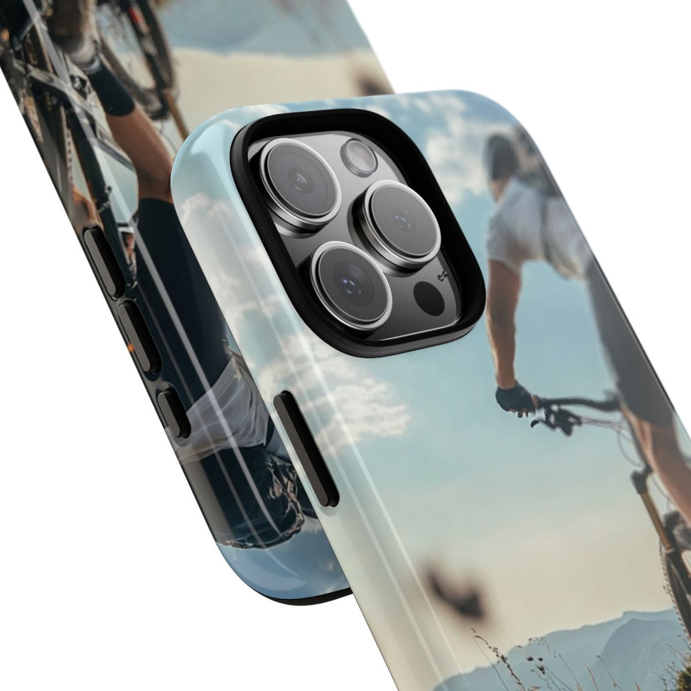 Dit hoesje toont een mountainbiker die over een rotsachtig pad rijdt, omringd door gras en kleine planten. De fietser draagt een wit shirt, zwarte shorts, zwarte handschoenen en een zwarte rugzak. De scène speelt zich buiten af, met een deels bewolkte lucht en bergen op de achtergrond. Het glanzende, stevige hoesje is gemaakt van duurzame materialen en biedt optimale bescherming voor je telefoon, terwijl draadloos opladen mogelijk blijft.