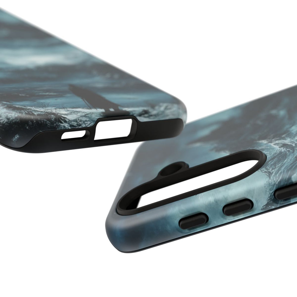 Dit hoesje toont een indrukwekkend berglandschap onder een bewolkte, sfeervolle lucht. In het midden prijkt een hoge, grillige bergtop, omringd door kleinere bergen en dichte bossen. Mist en nevel zweven over het landschap en zorgen voor een geheimzinnige sfeer. Op de voorgrond staat een eenzame figuur met een staf bij een rustige waterplas. Koele blauwe en grijze tinten benadrukken het gevoel van stilte en ongerepte natuur. Het hoesje heeft een stevige polycarbonaat buitenkant en een TPU-binnenlaag voor dubbele bescherming en is geschikt voor draadloos opladen.