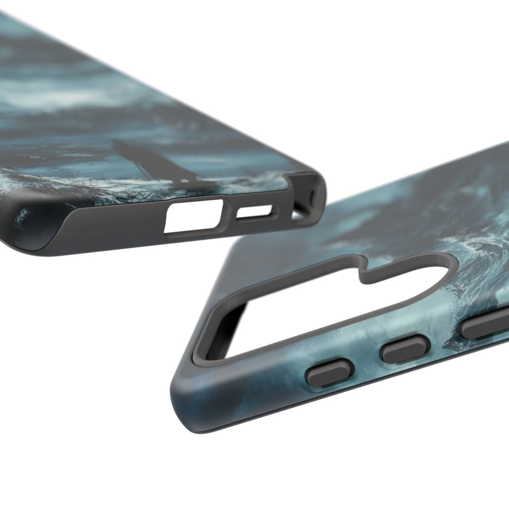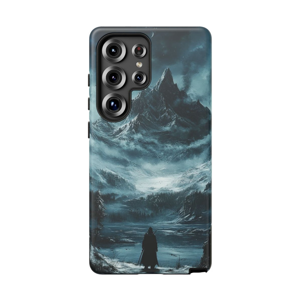 Dit hoesje toont een donker en sfeervol berglandschap onder een bewolkte nachtelijke hemel. In het midden rijst een hoge, grillige bergtop op, omgeven door mist en dichtbegroeid bos. Op de voorgrond staat een eenzame figuur bij een rustig water, wat een gevoel van schaal en afzondering toevoegt. De kleuren zijn koel en donker, met diepe blauwtinten en grijstinten. Het hoesje heeft een stevige polycarbonaat buitenkant en een TPU-binnenzijde voor dubbele bescherming en is geschikt voor draadloos opladen.