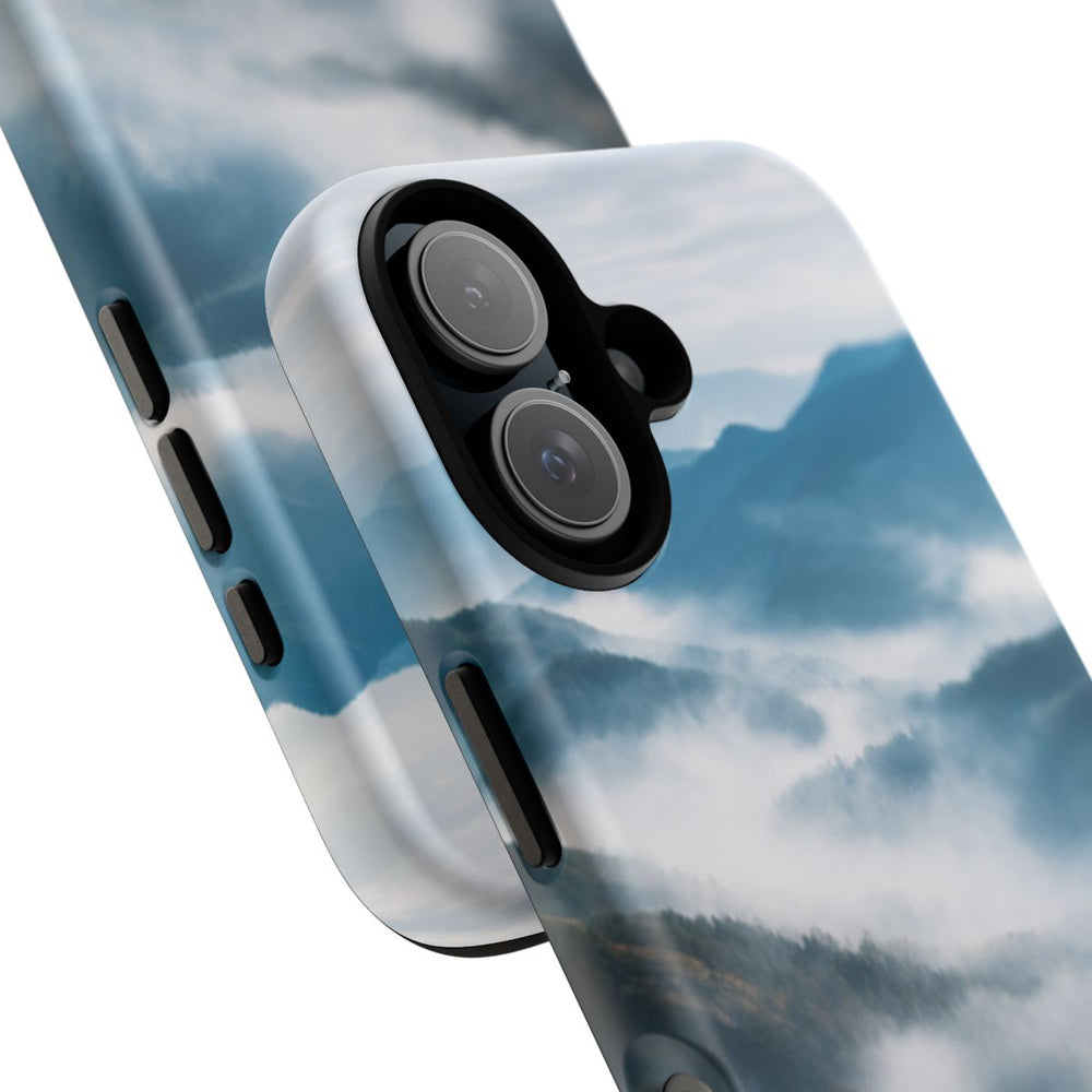 Dit hoesje toont een indrukwekkend uitzicht van bovenaf op bergtoppen die deels zijn gehuld in mist en lage wolken. Het landschap bestaat uit verschillende lagen bergen die vervagen aan de horizon onder een bewolkte hemel. De mist zorgt voor een zachte, dromerige sfeer en vloeit samen met de blauwe tinten van de bergen en de lucht. De afbeelding is gedrukt op een mat hoesje met een stevige polycarbonaat buitenkant en een TPU binnenzijde, wat zorgt voor dubbele bescherming en geschikt is voor draadloos opladen. De koele blauwtinten bepalen het kleurgebruik van het ontwerp.