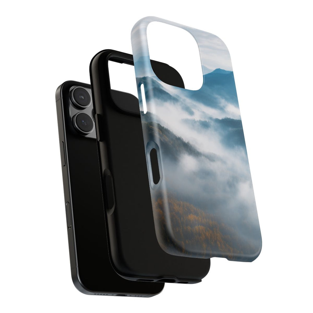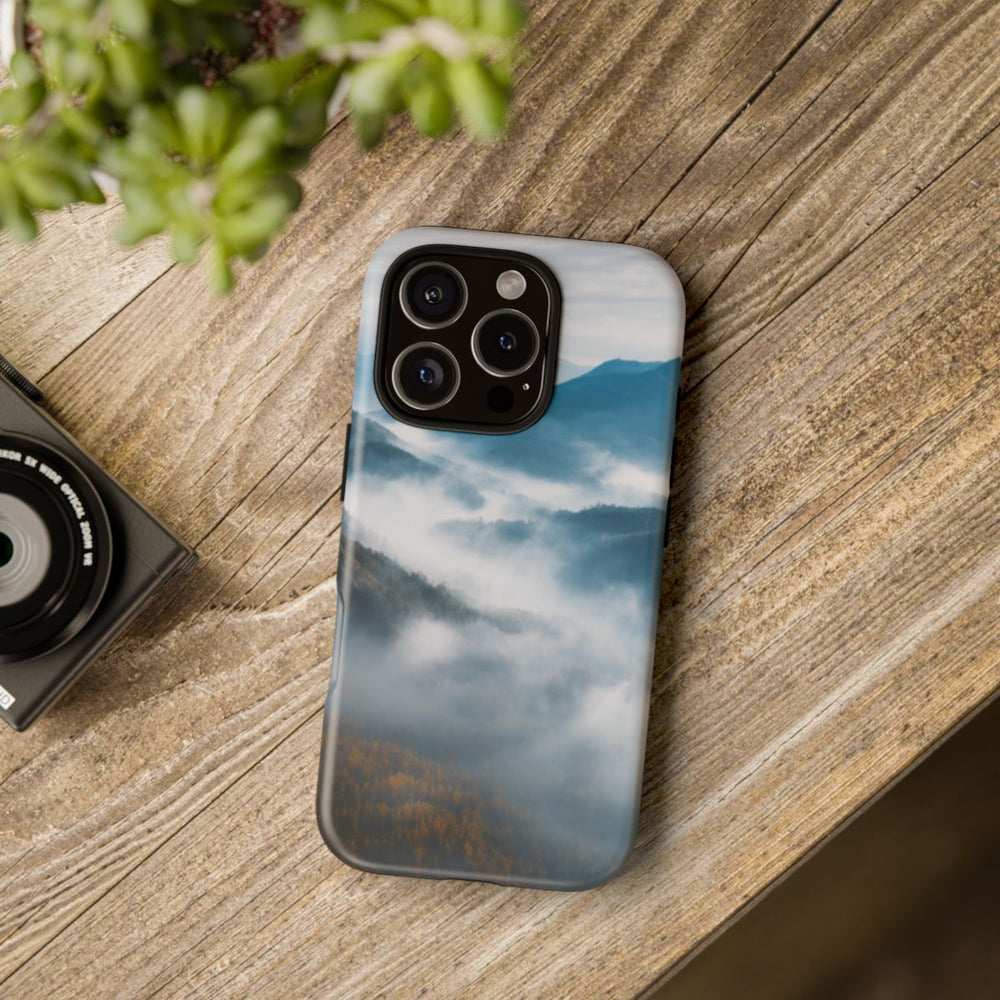 Dit hoesje toont een indrukwekkend uitzicht van bovenaf op bergtoppen die deels zijn gehuld in mist en lage wolken. Het landschap bestaat uit verschillende lagen bergen die vervagen aan de horizon onder een bewolkte hemel. De mist zorgt voor een zachte, dromerige sfeer en vloeit samen met de blauwe tinten van de bergen en de lucht. De afbeelding is gedrukt op een mat hoesje met een stevige polycarbonaat buitenkant en een TPU binnenzijde, wat zorgt voor dubbele bescherming en geschikt is voor draadloos opladen. De koele blauwtinten bepalen het kleurgebruik van het ontwerp.